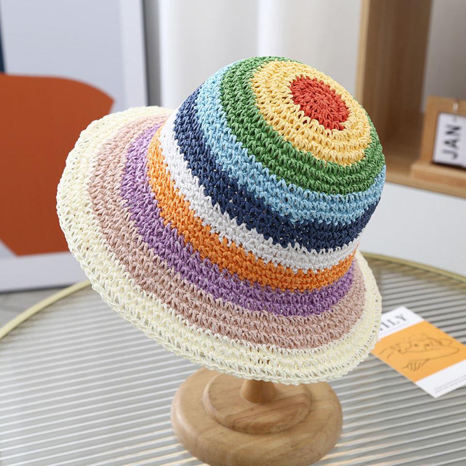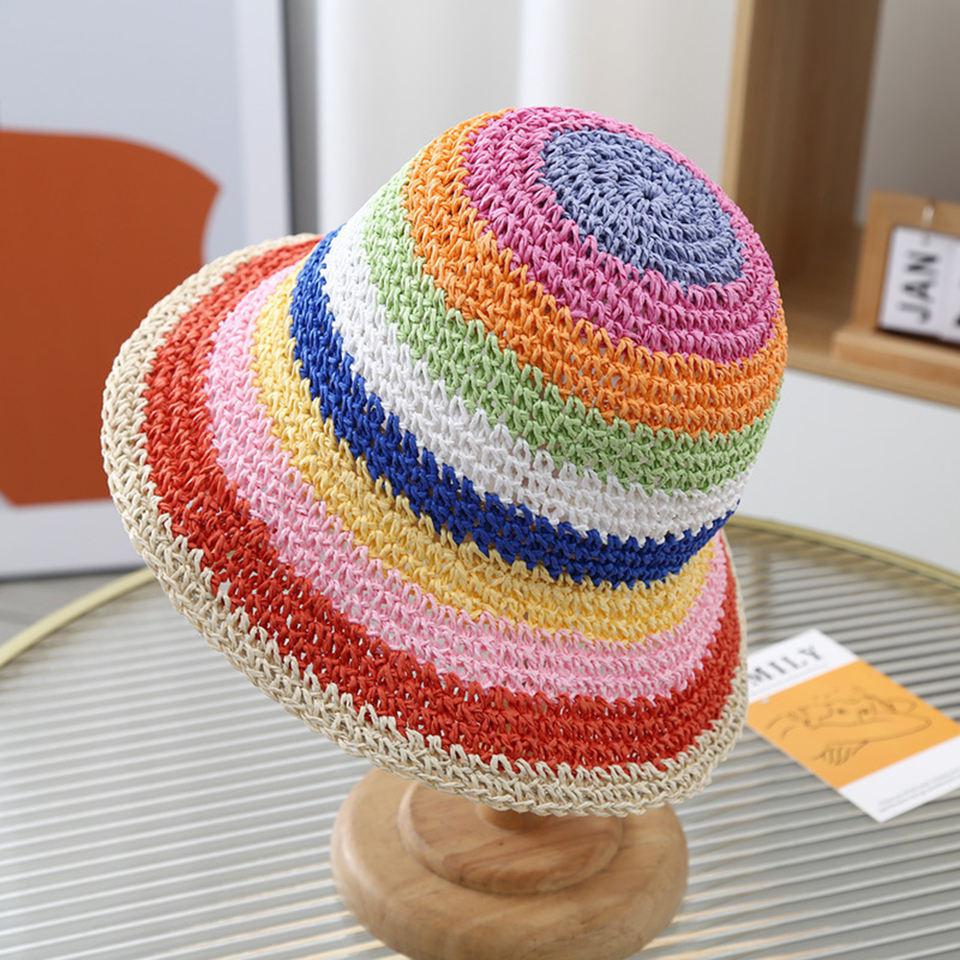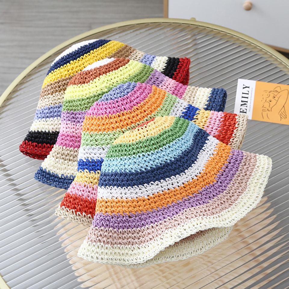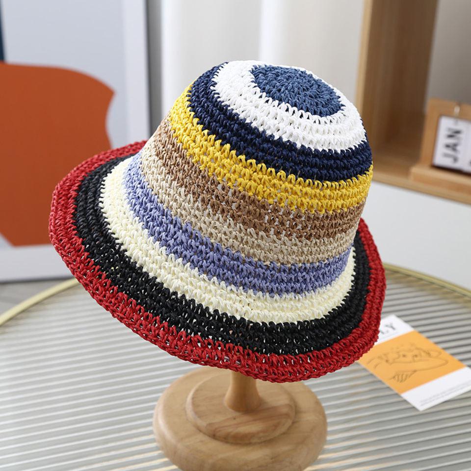 Crochet Hat with Multicolored Stripes, Trendy Summer Fashion Beach Sunshade Handmade Crochet Fisherman Hat Small Brim Foldable Floppy Bucket Straw Hats For Men/women; Adult One Size Fits Most (22-23 inches), adjustable size
