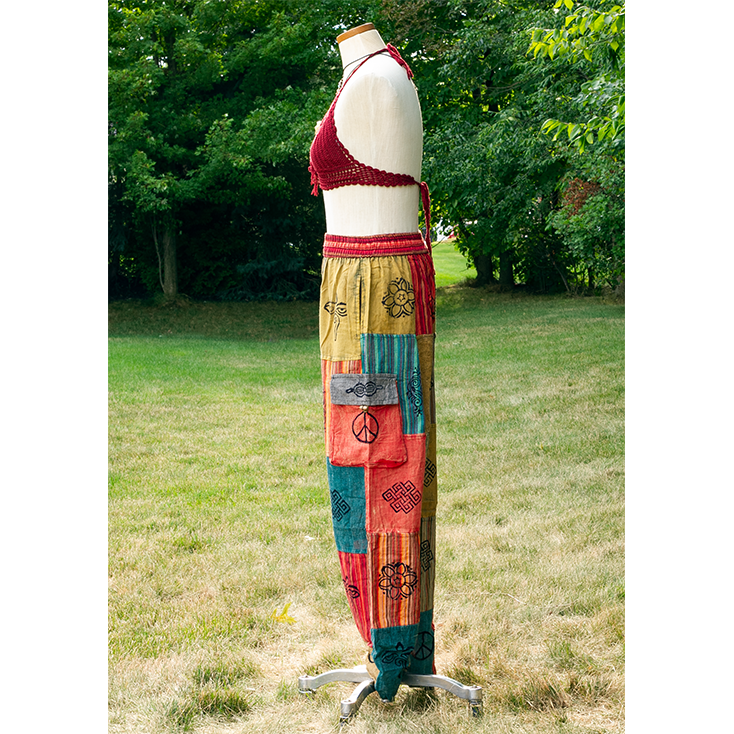 Each of these handmade patchwork pants with pockets has a unique applique attached- dorji, peace sign, om symbol, etc.. It also has brush strokes for enhanced look. Elastic waist with a pullstrong to adjust sizes. Comfrtable bottoms with a retro profile. Ultra-soft cotton fabric that is soft on skin and will get even more supple with time. Hand wash or gentle machine wash. No dryer. Imported.