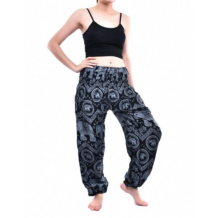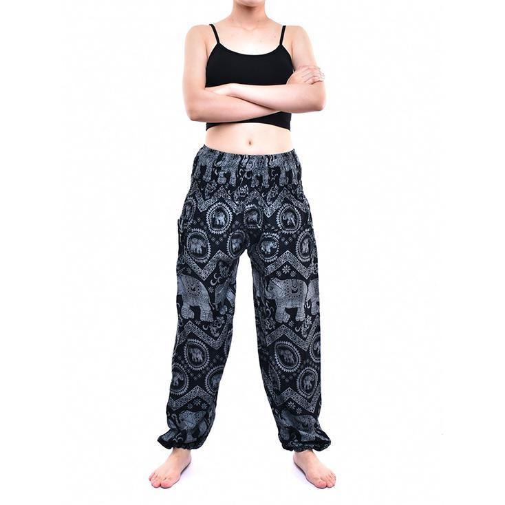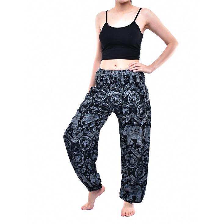 Black & Grey Elephant Print Comfortable Elastic Thai Harem Pants with single pocket 100% Rayon