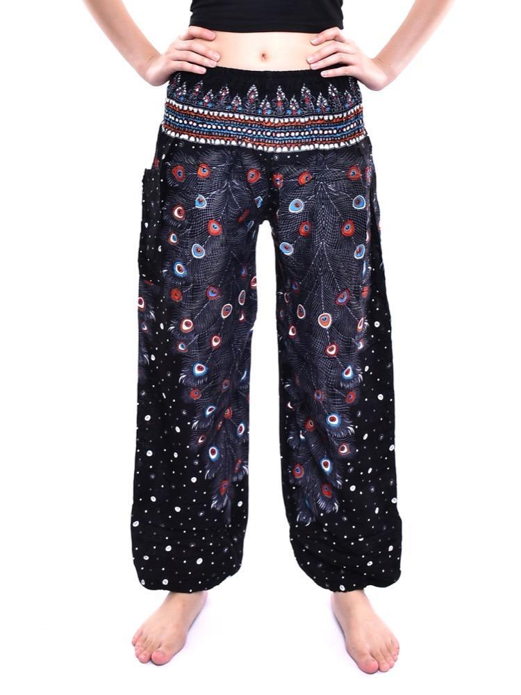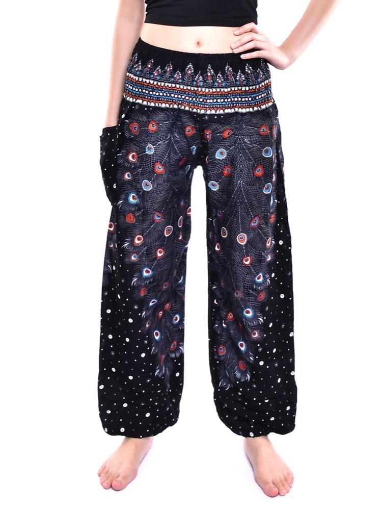 Black Print Elastic Thai Harem Pants with single pocket Plain solid color with peacock feather prints 100% Rayon