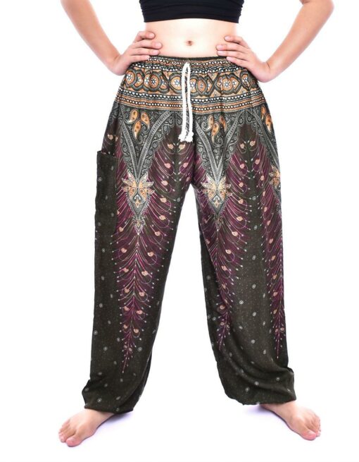 Olive Green Peacock feather Print draw string Thai Harem Pants with single pocket 100% Rayon