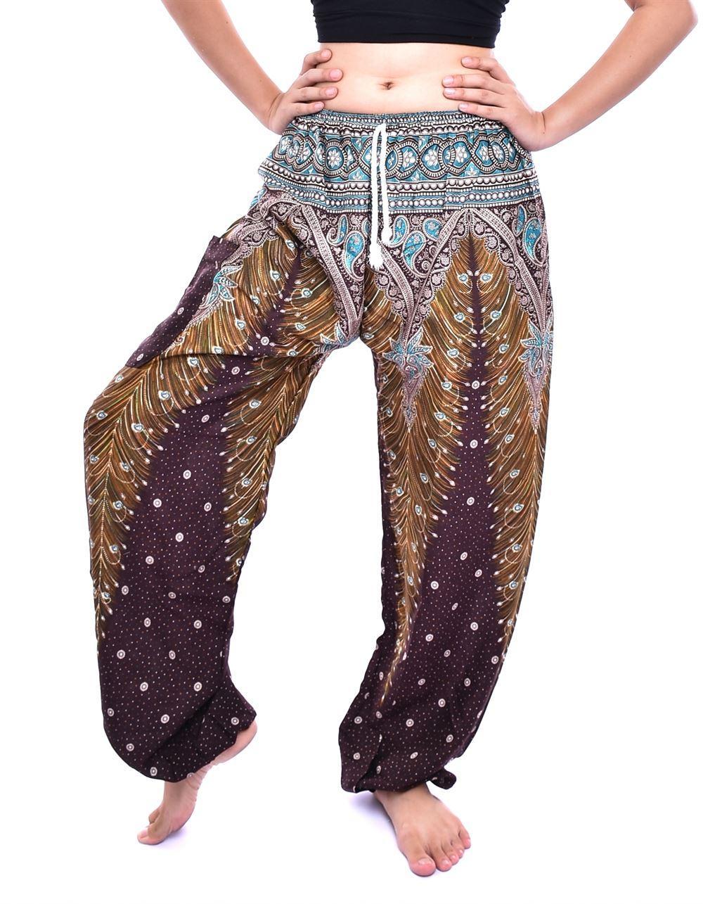 Dark Brown Peacock feather Print draw string Thai Harem Pants with single pocket 100% Rayon