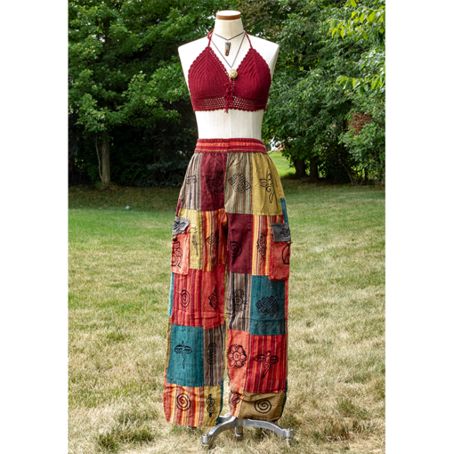 Each of these handmade patchwork pants with pockets has a unique applique attached- dorji, peace sign, om symbol, etc.. It also has brush strokes for enhanced look. Elastic waist with a pullstrong to adjust sizes. Comfrtable bottoms with a retro profile. Ultra-soft cotton fabric that is soft on skin and will get even more supple with time. Hand wash or gentle machine wash. No dryer. Imported.
