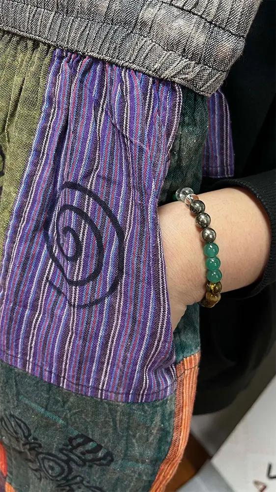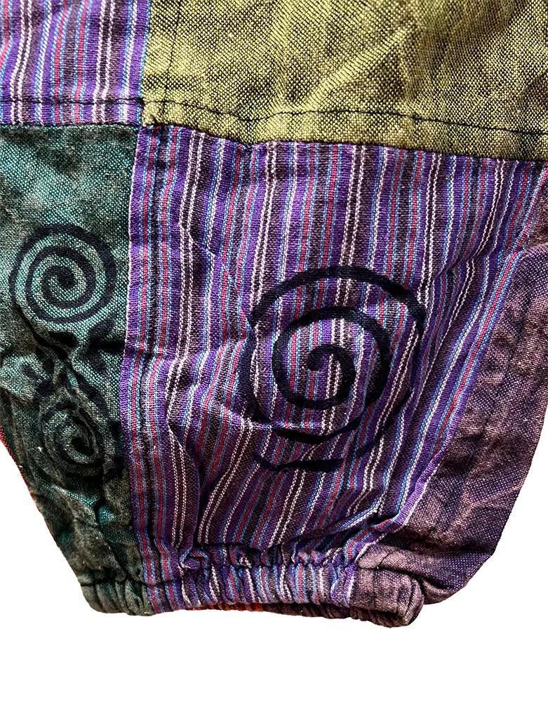 Each of these handmade patchwork pants with pockets has a unique applique attached- dorji, peace sign, om symbol, etc.. Elastic waist with a pullstrong to adjust sizes. Gathered bottoms with a retro profile. Ultra-soft cotton fabric that is soft on skin and will get even more supple with time. Hand wash or gentle machine wash. No dryer. Imported.