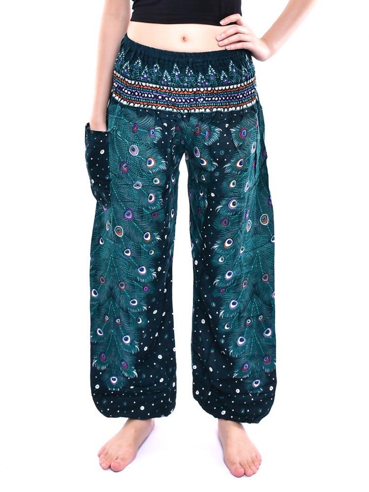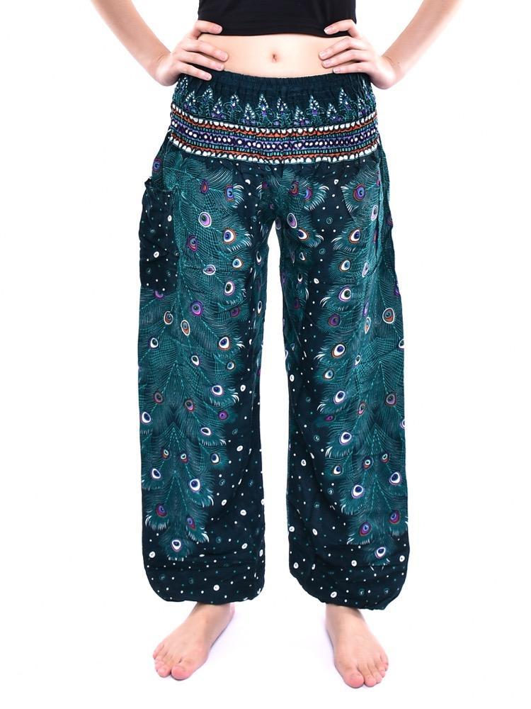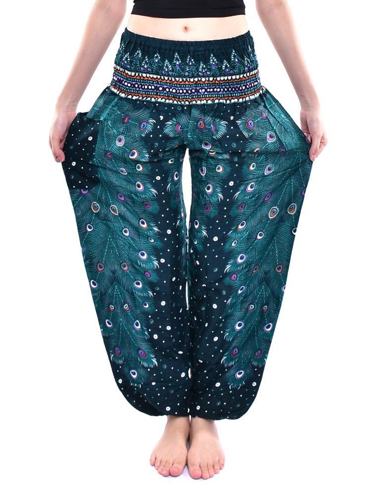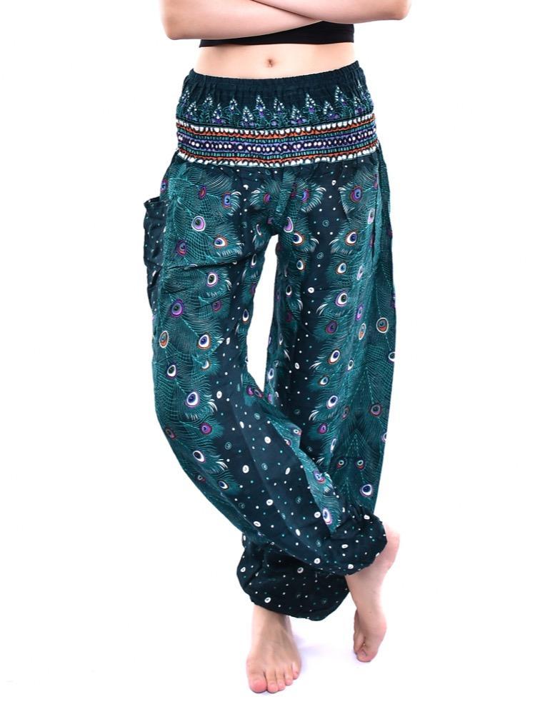 Teal Peacock Feather Print Elastic Harem Pants with single pocket Plain solid color 100 % Rayon