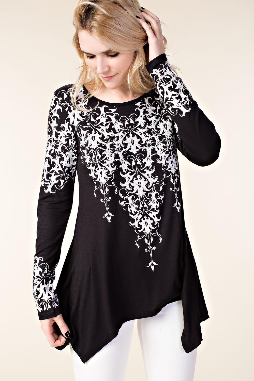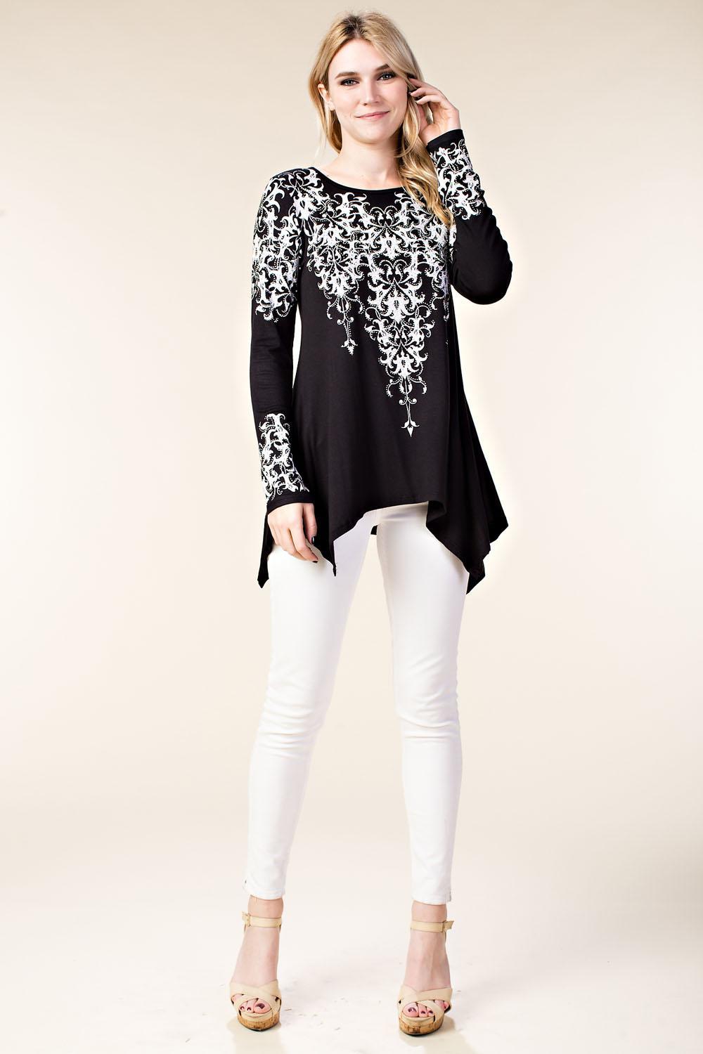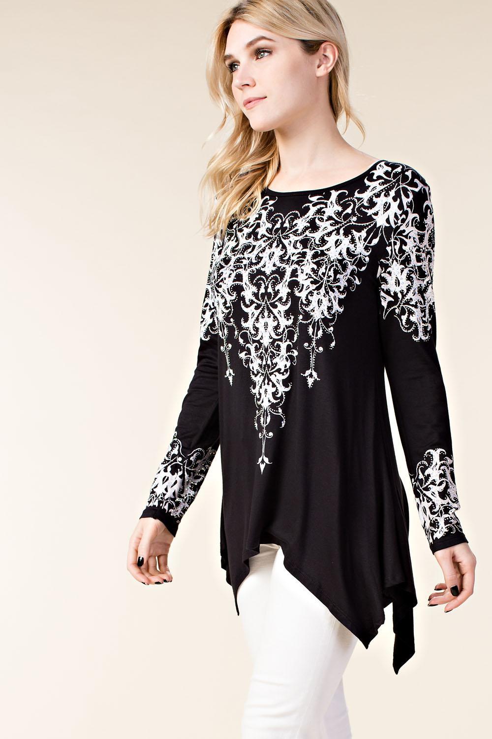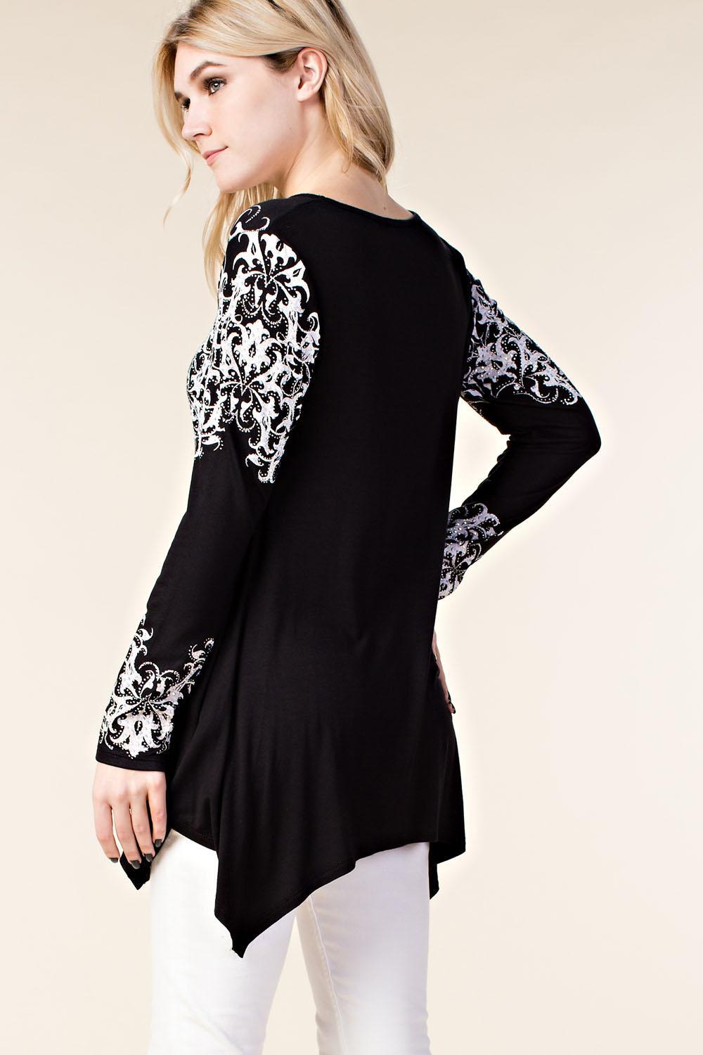 15503L-Top , Long Sleeves Bling Top With Print and Stones By Vocal
