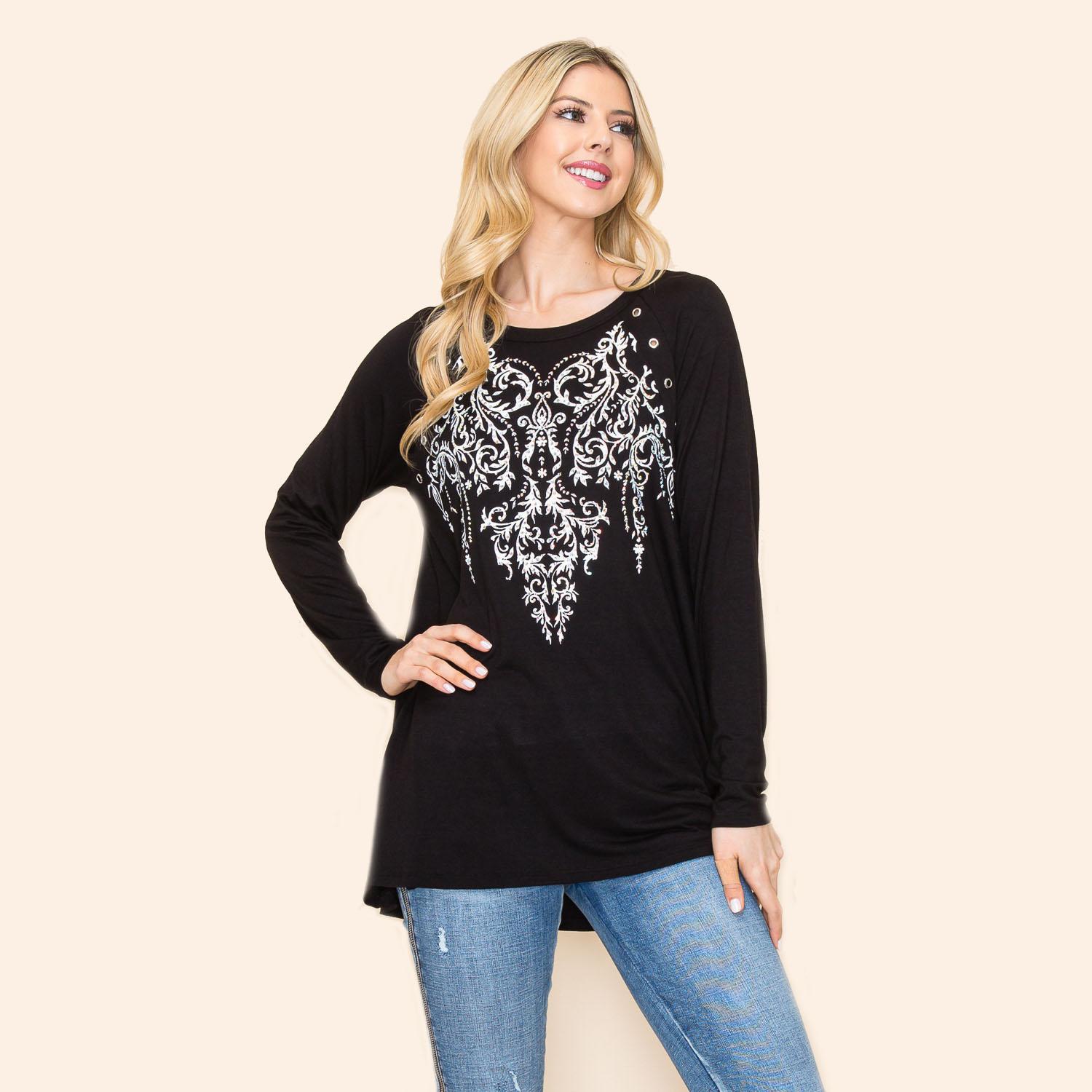 20492L-Top, LONG SLEEVE SWING FLARE HEM TOP With Rhinestone and Grommets by Vocal