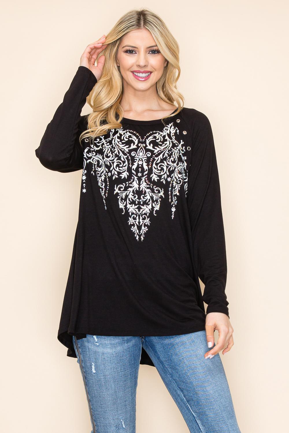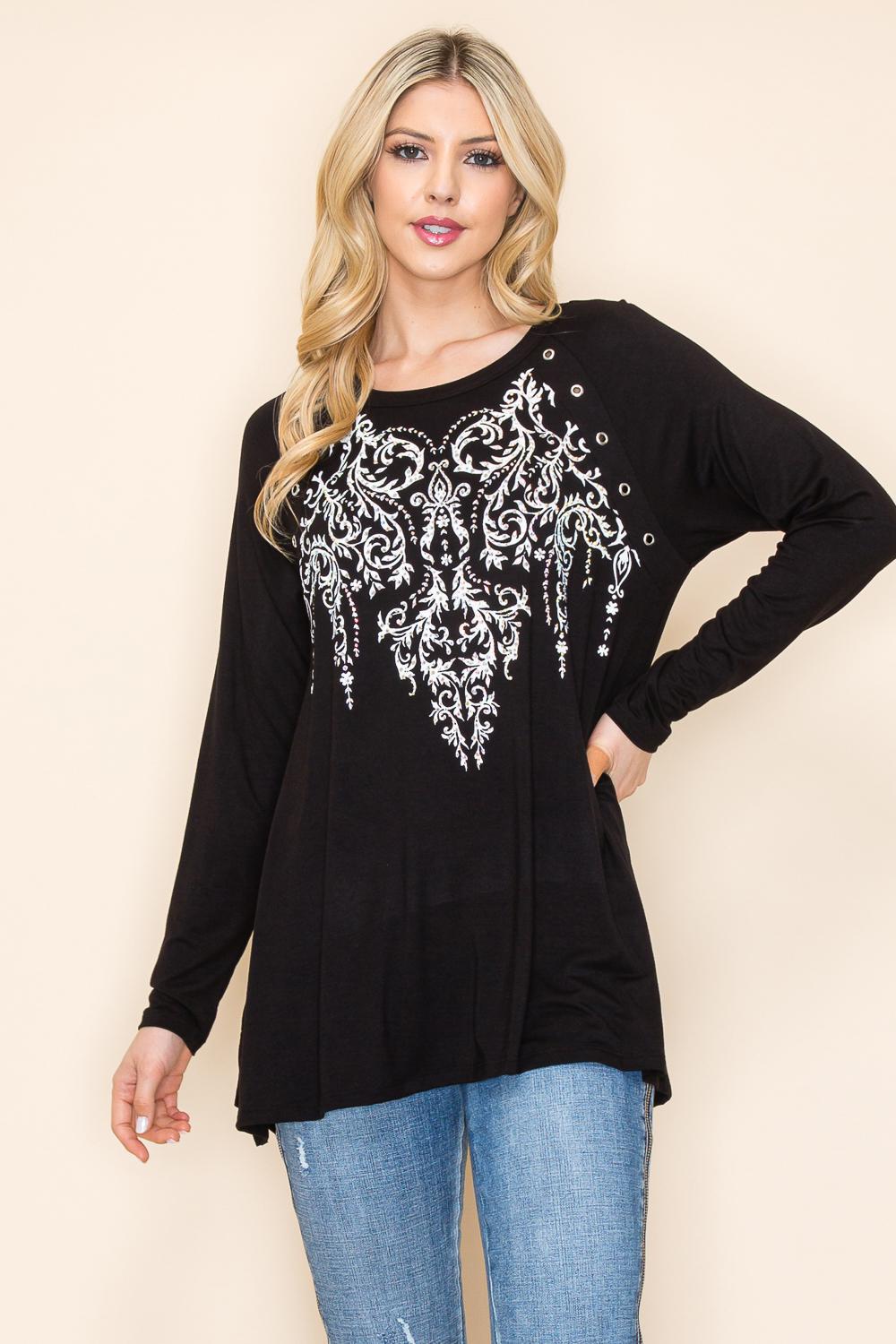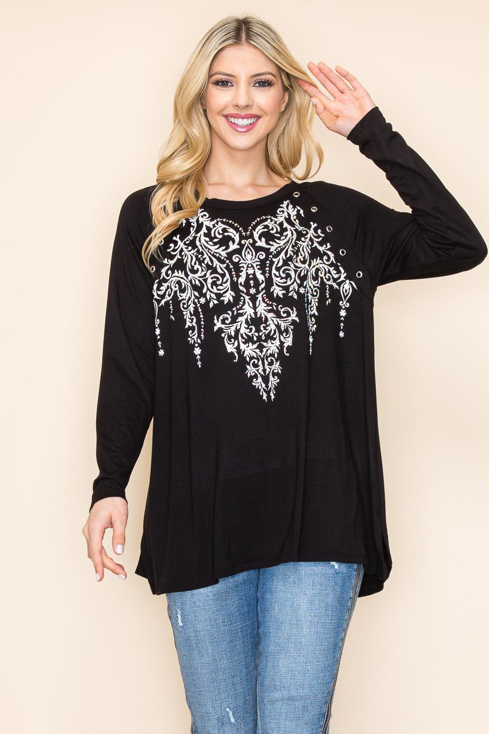 20492L-Top,  LONG SLEEVE SWING FLARE HEM TOP With Rhinestone and Grommets by Vocal