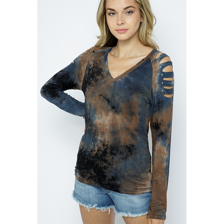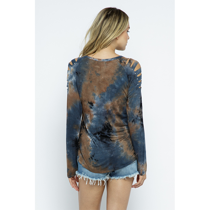 Cold Shoulder Tie Dyed Vocal Top with Rhinestones