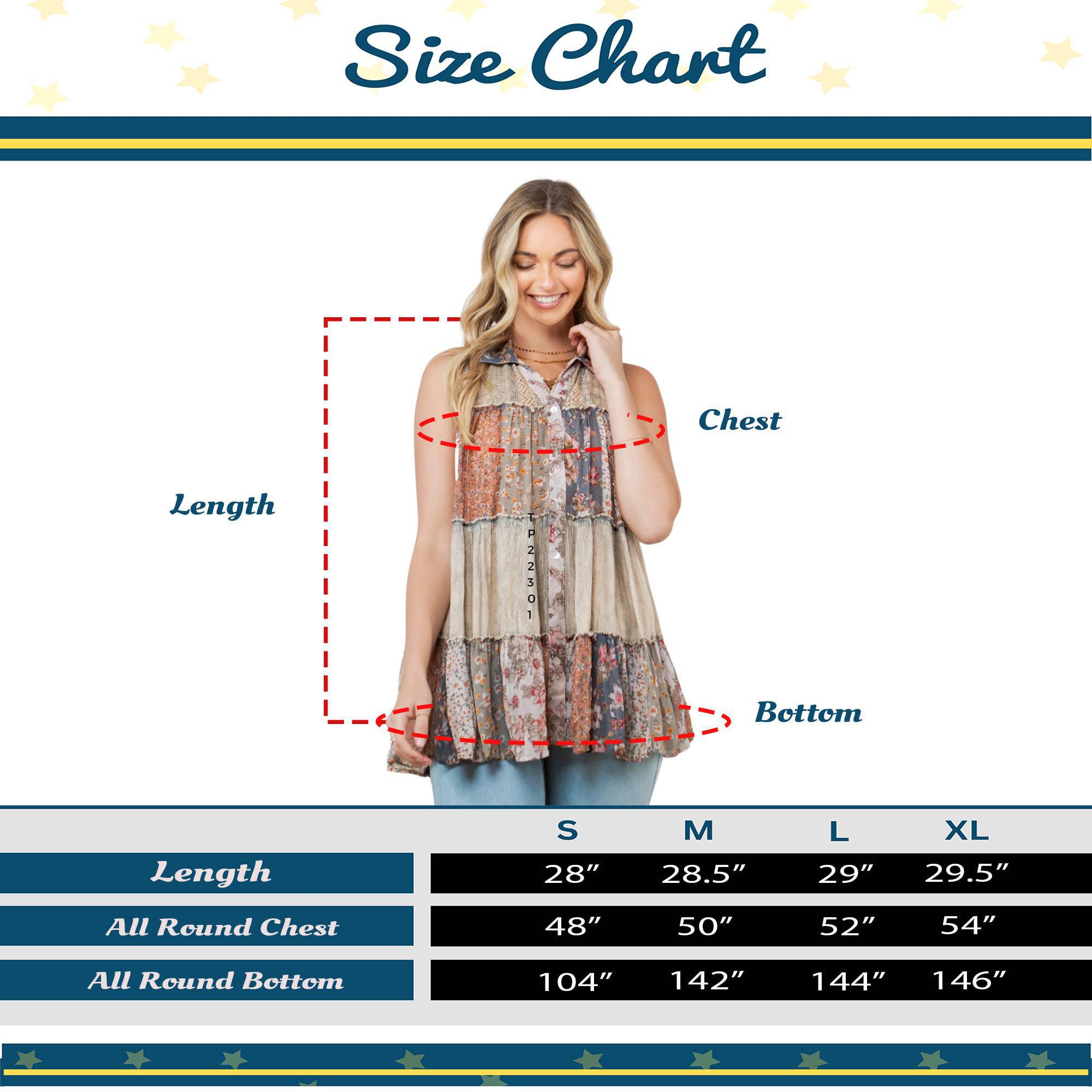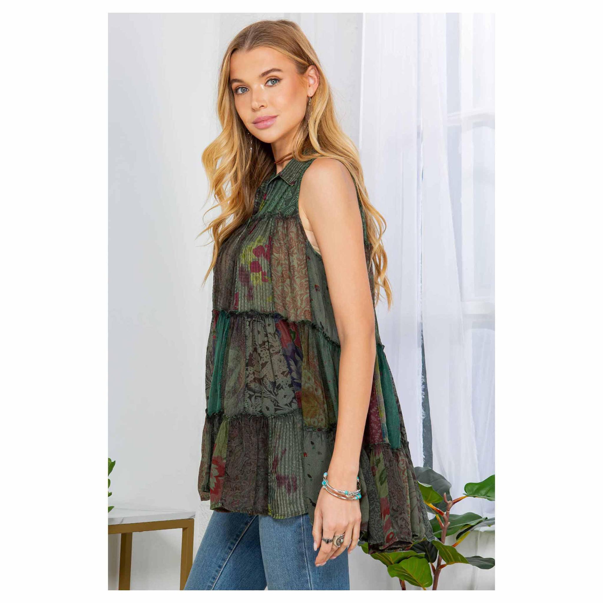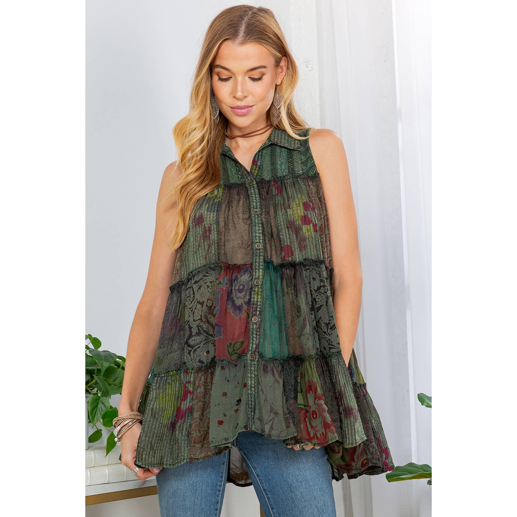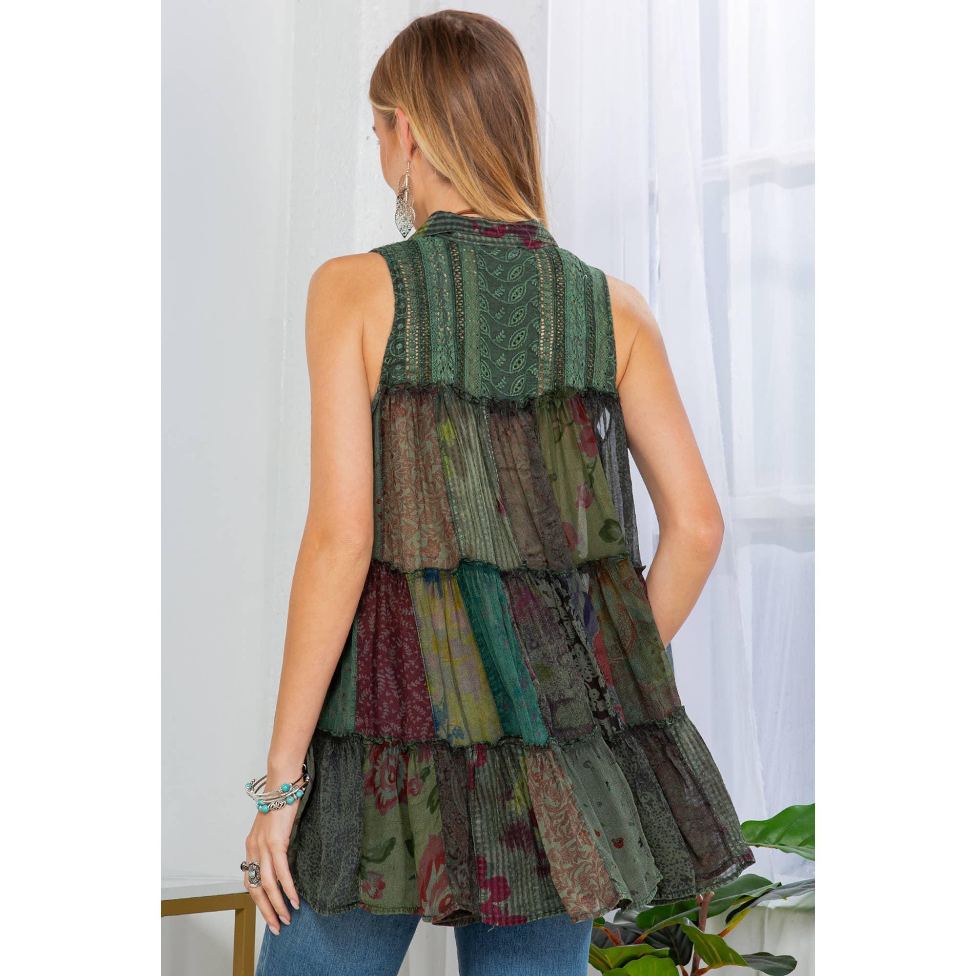 Like your favorite thrifted treasure, but new! Mismatched patterns dance together on this easy-breezy boho chic buttondown patchwork sleeveless top.