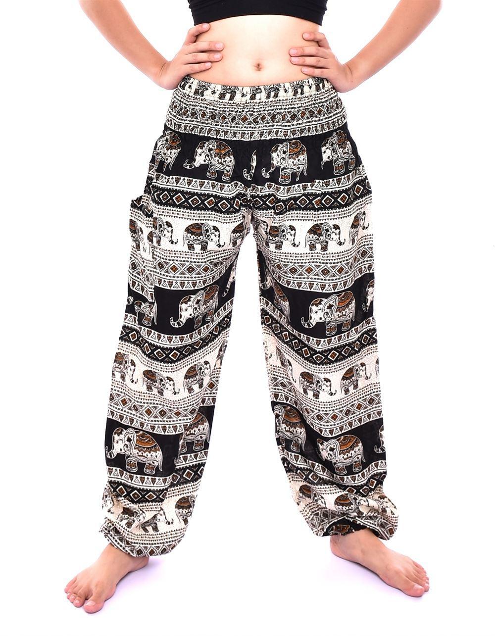 Thai Harem Pants Elastic Waist with Elephant Print and single pocket, Boho Pants Hippie Style Yoga comfort Bohemian 100% Rayon