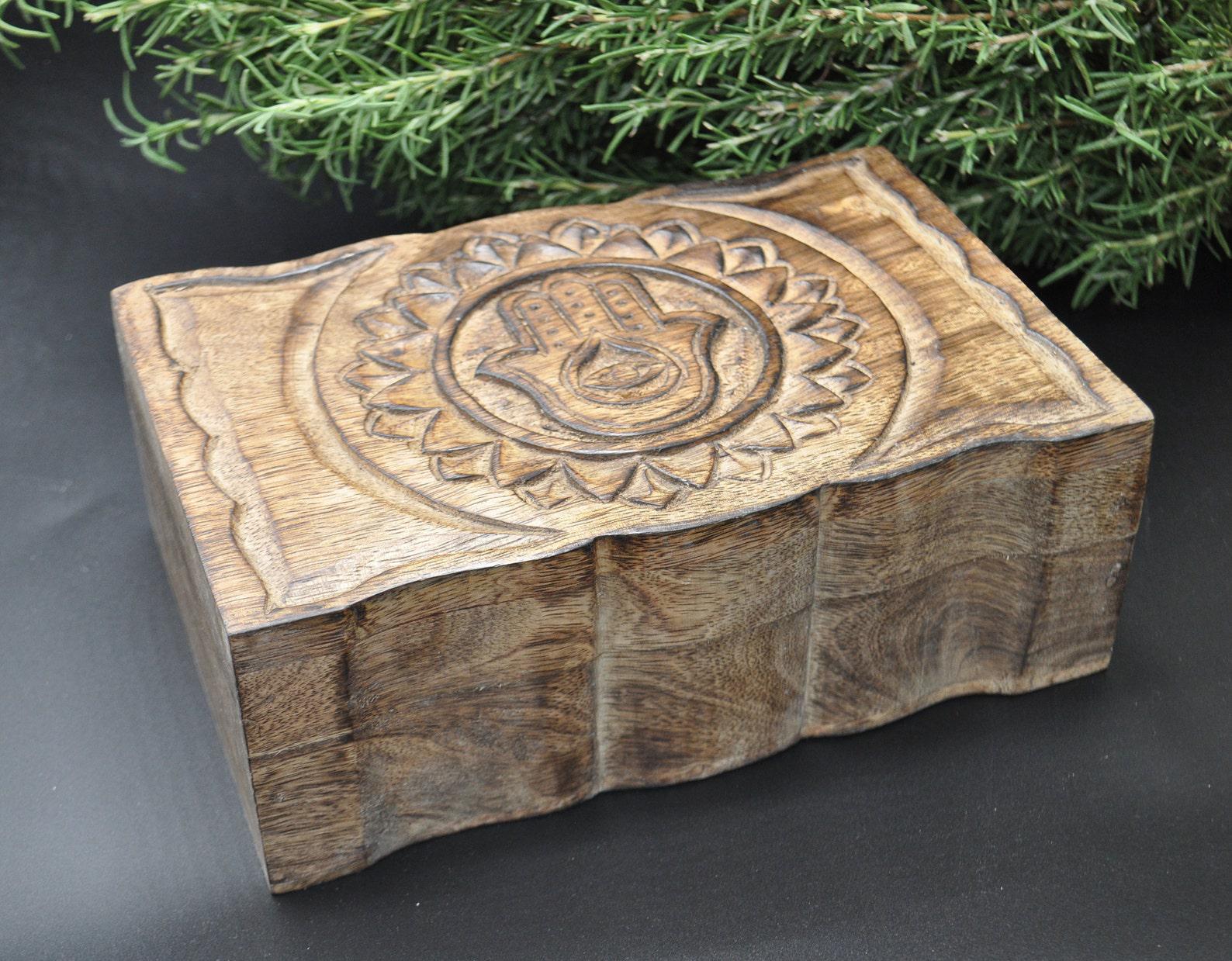 Hand Carved Decorative Hamsa Hand Evil Eye Wooden Storage Box, 9"x6"x2.75"