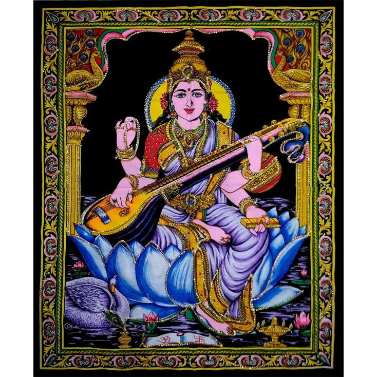 Goddess Saraswathi / Goddess of Knowledge Poster Wall Hanging Handmade Cotton Tapestry 40″x30″ inch (No Sequin)