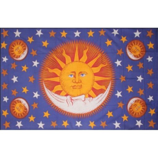 Sun Moon Star Horizontal Hang Blue Base Wall Hanging Handmade Cotton Tapestry 84″ x 54″ inch