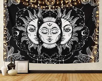 Big Sun Split and Moon Horizontal Hang Tapestry Black and White 84″ x 54″ Inch