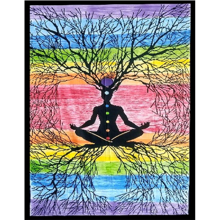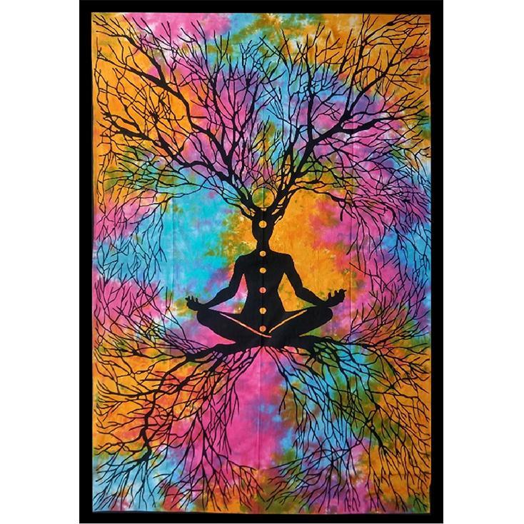 Yoga Man with Roots / 7-Chakra Meditating Man with Roots Wall Hanging Handmade Cotton Tapestry 84″ x 54″ inch
