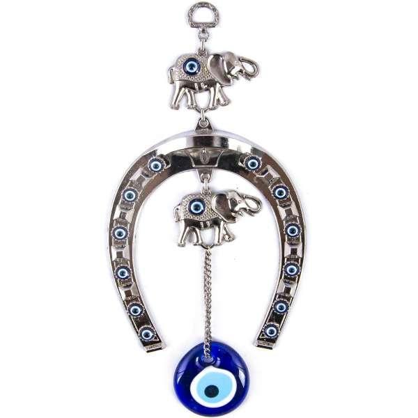 11″ Inch Horseshoe with 2 Elephant and Evil Eye Hanging, Handmade