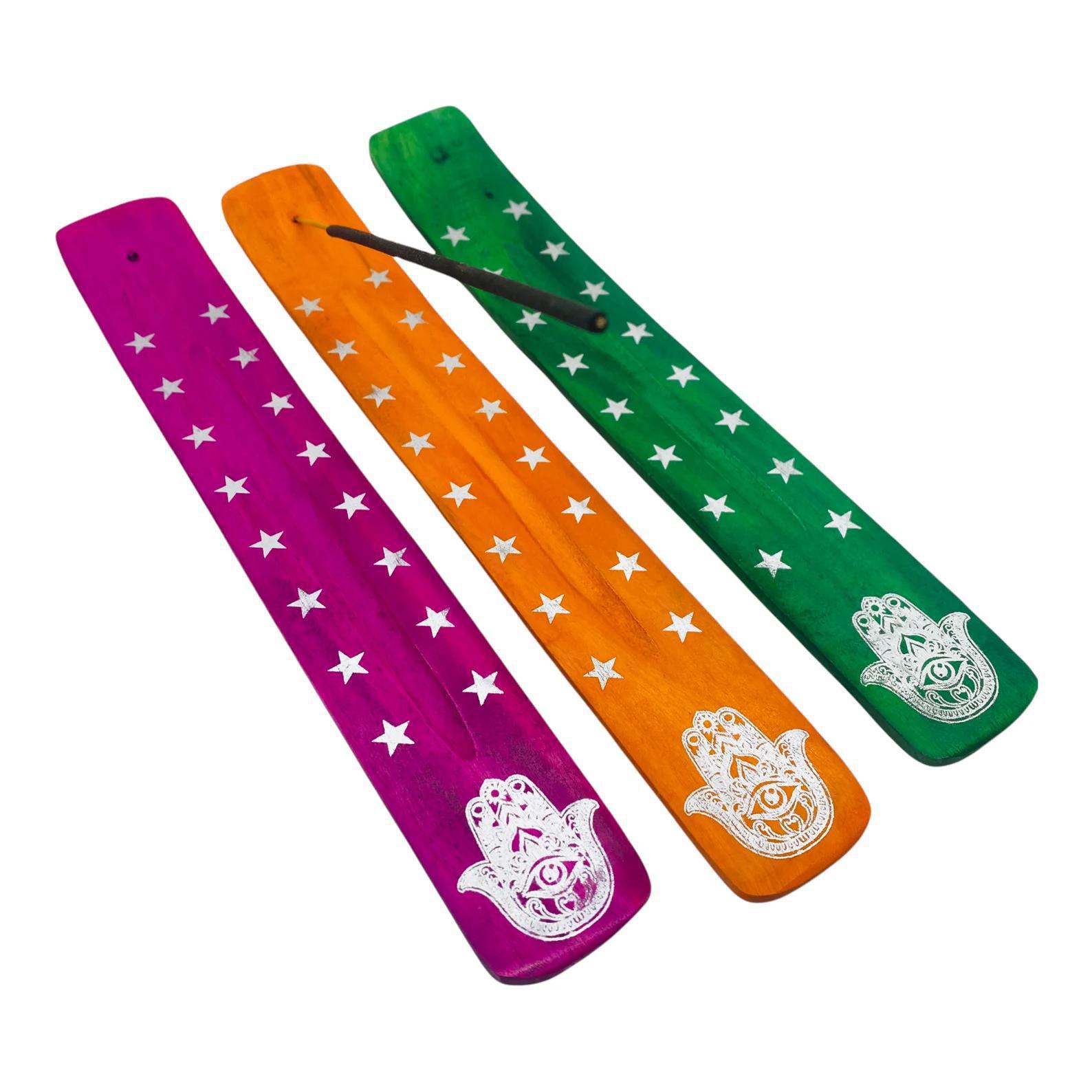 To burn incense is to send a prayer on the wind. This ash catcher is a focal point for that ritual. Painted in a variety of vibrant colors, each burner is adorned with the sacred Hamsa Hand—an ancient symbol of protection, good fortune, and the hand of the Divine. A trail of celestial stars guides the smoke, making this the perfect companion for the healer, the mystic, or anyone seeking to protect their sacred space.