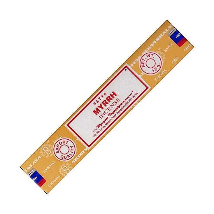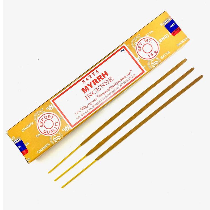 Satya Myrrh Incense Sticks are handcrafted in India using pure resins and natural extracts, ensuring an authentic and sacred aromatic experience for deep meditation and purification rituals.