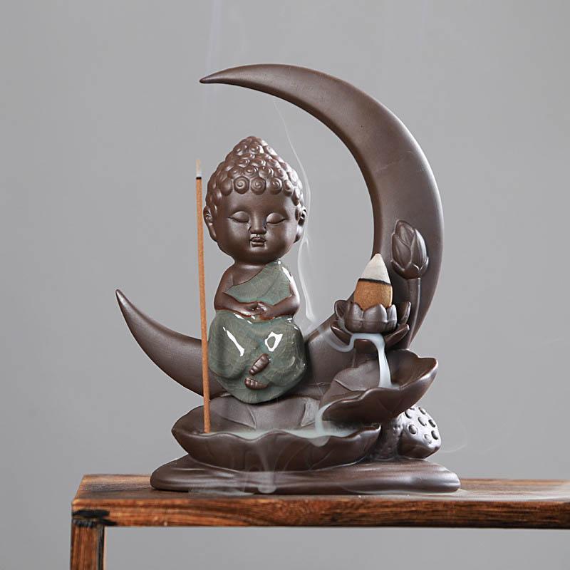 Crescent Moon with Buddha in Meditating Pose Backflow Incense Burner, Reflux Burner, Large Handmade Ceramic Backflow Cone Sticks Incense Holder Home Décor Craftwork Figurine Size: 13.5 * 16.5 cm