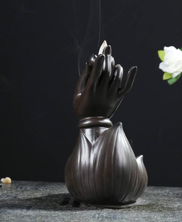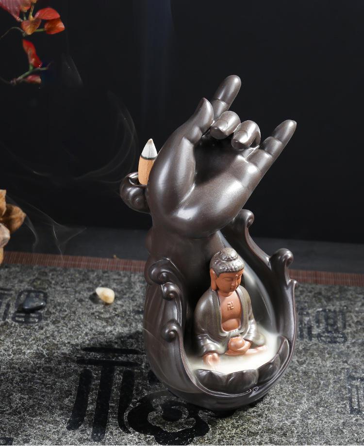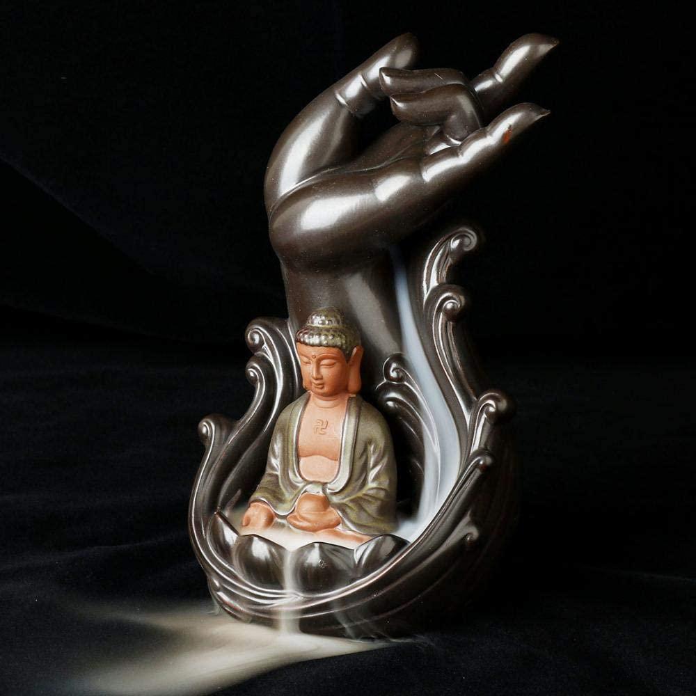 Meditating Buddha with Hand Ceramic Backflow Incense Holder Waterfall Incense Burner, Reflux Burner, Handmade Ceramic, Home Décor for Meditation, Mini-Zen Experience Size: 11 * 21cm / 4.33”x 8.26”(L x H)