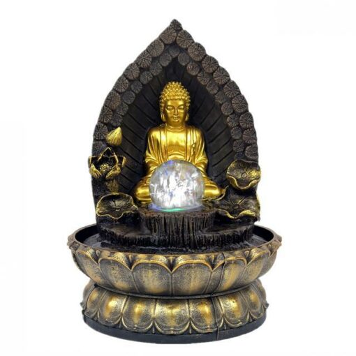 Buddha with Crystal Ball Golden Meditating Buddha on a Lotus Base with Crystal & LED Light Antique Resin Tabletop Waterfall Fountain