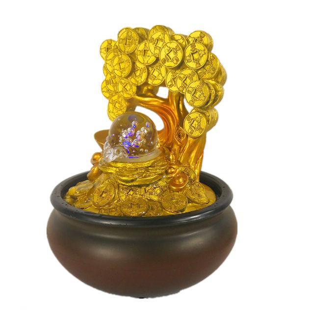 Golden Money Tree Fountain with Rolling Crystal Ball & LED Antique Resin Tabletop Waterfall Fountain 16X16X20 cm