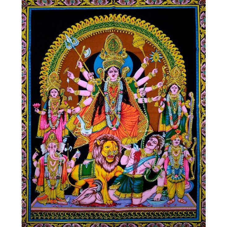 Goddess Durga Maa Durga with Ganesh & Lion without Sequin Poster Wall Hanging Handmade Cotton Tapestry 40″x30″ inch