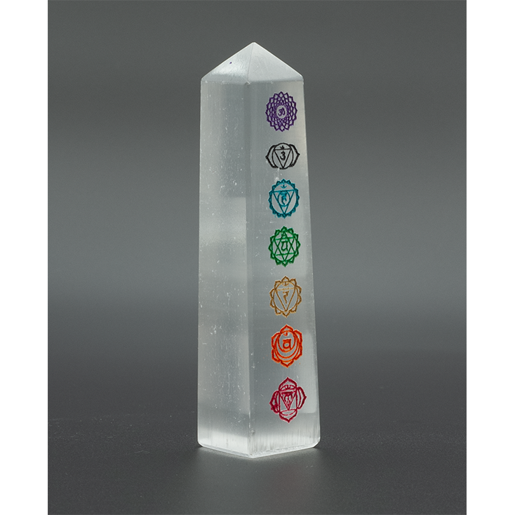 Selenite 7-Chakra Engraved Symbols Pointed Obelisk Tower Point in Natural Crystal Stones Metaphysical Balance Energy Approx. 4 inches tall