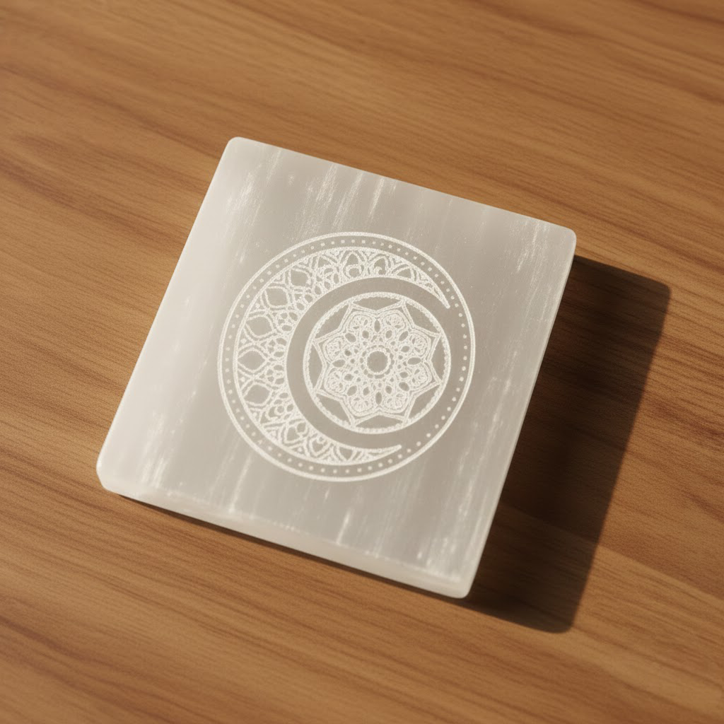 The Selenite Square Moon Mandala Plate is a masterfully designed tool for those who seek to bridge the gap between their physical environment and the celestial realms. Selenite is historically revered as a mineral of “Celestial Radiance,” unique for its ability to constantly transmute heavy vibrations into pure, refined light. By combining this potent stone with the intricate geometry of a Moon Mandala, this 100% handmade plate acts as a spiritual eraser—smoothing out auric disruptions and providing a secure, grounded sanctuary for your practice.