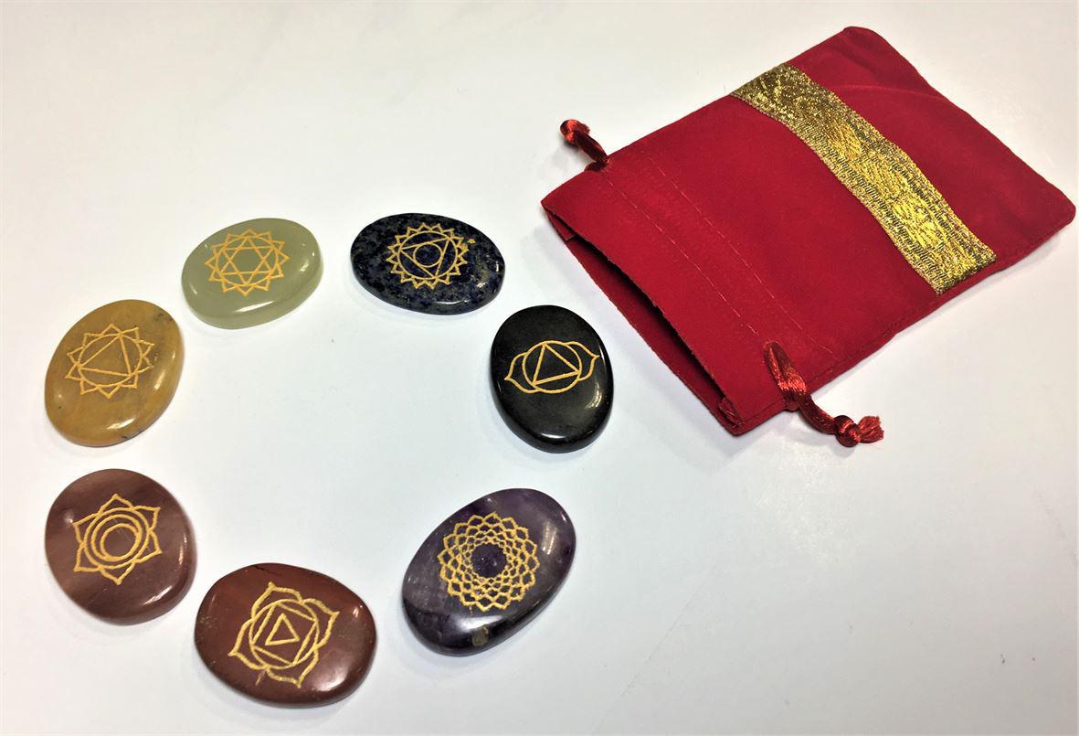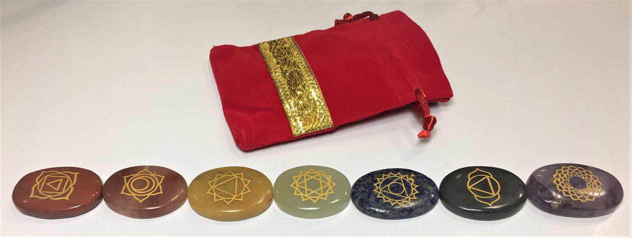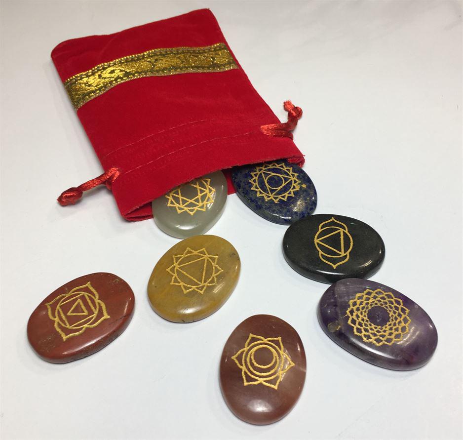 7-Chakra Stone Set Engraved Oval / Round Gemstone in Black Velvet Chakra Pouch