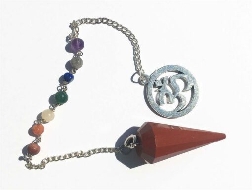 Beautifully crafted Energy Pendulum having each of the 7 Chakra colors represented within its links on a silver chain and an Om Charm.