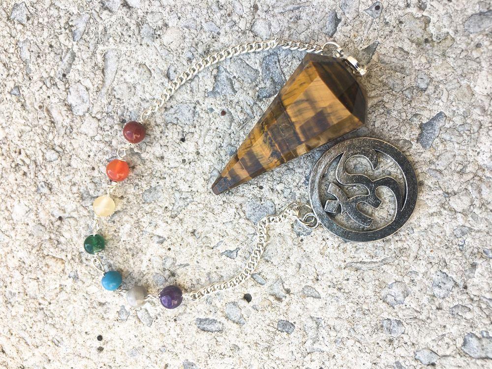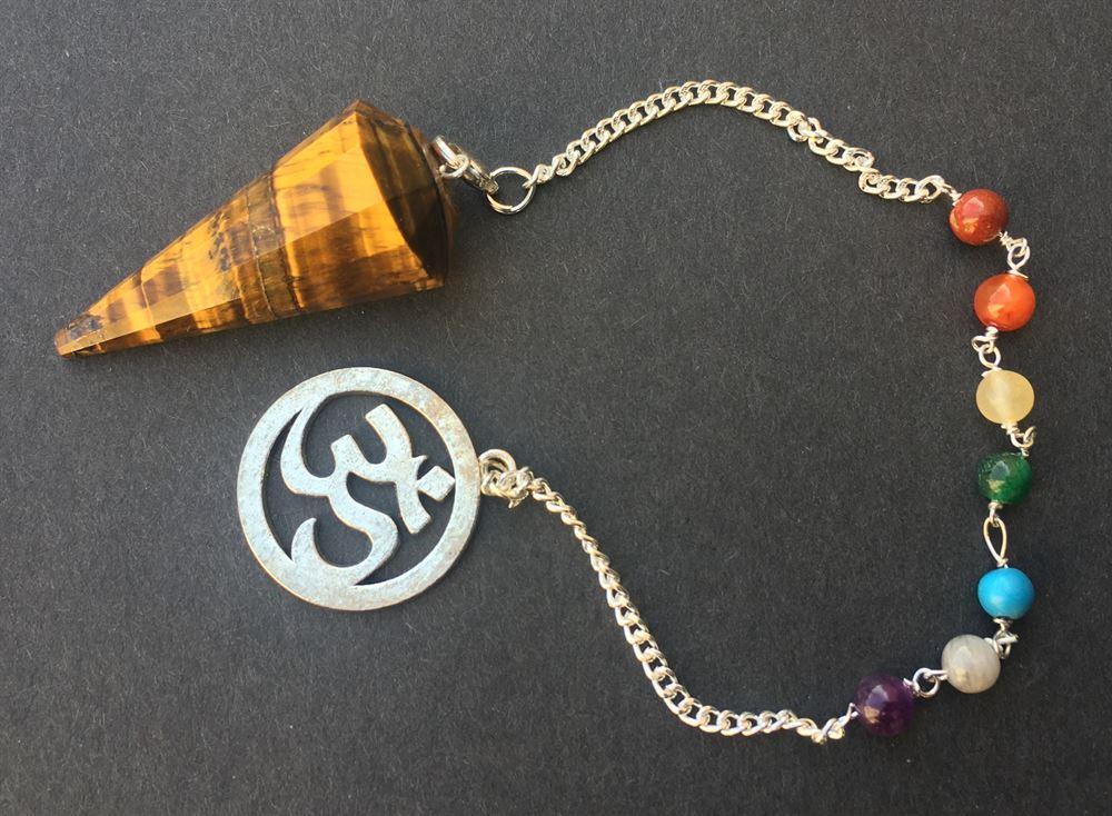 Beautifully crafted Energy Pendulum having each of the 7 Chakra colors represented within its links on a silver chain and an Om Charm.