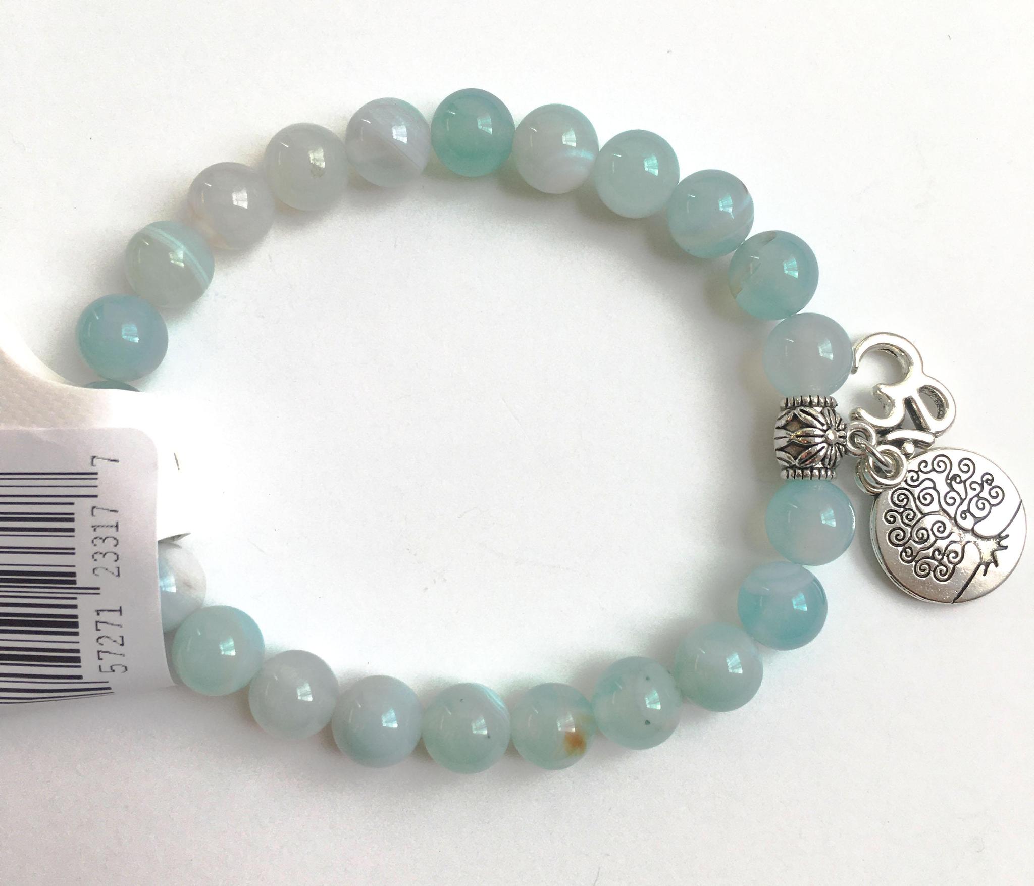 Blue Aqua Chalcedony Natural Stone Bracelet with Buddha, Om & Tree of Life Charms 8mm