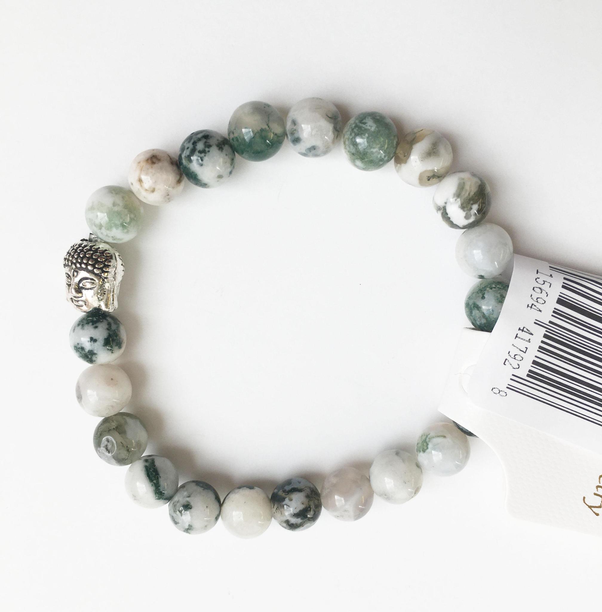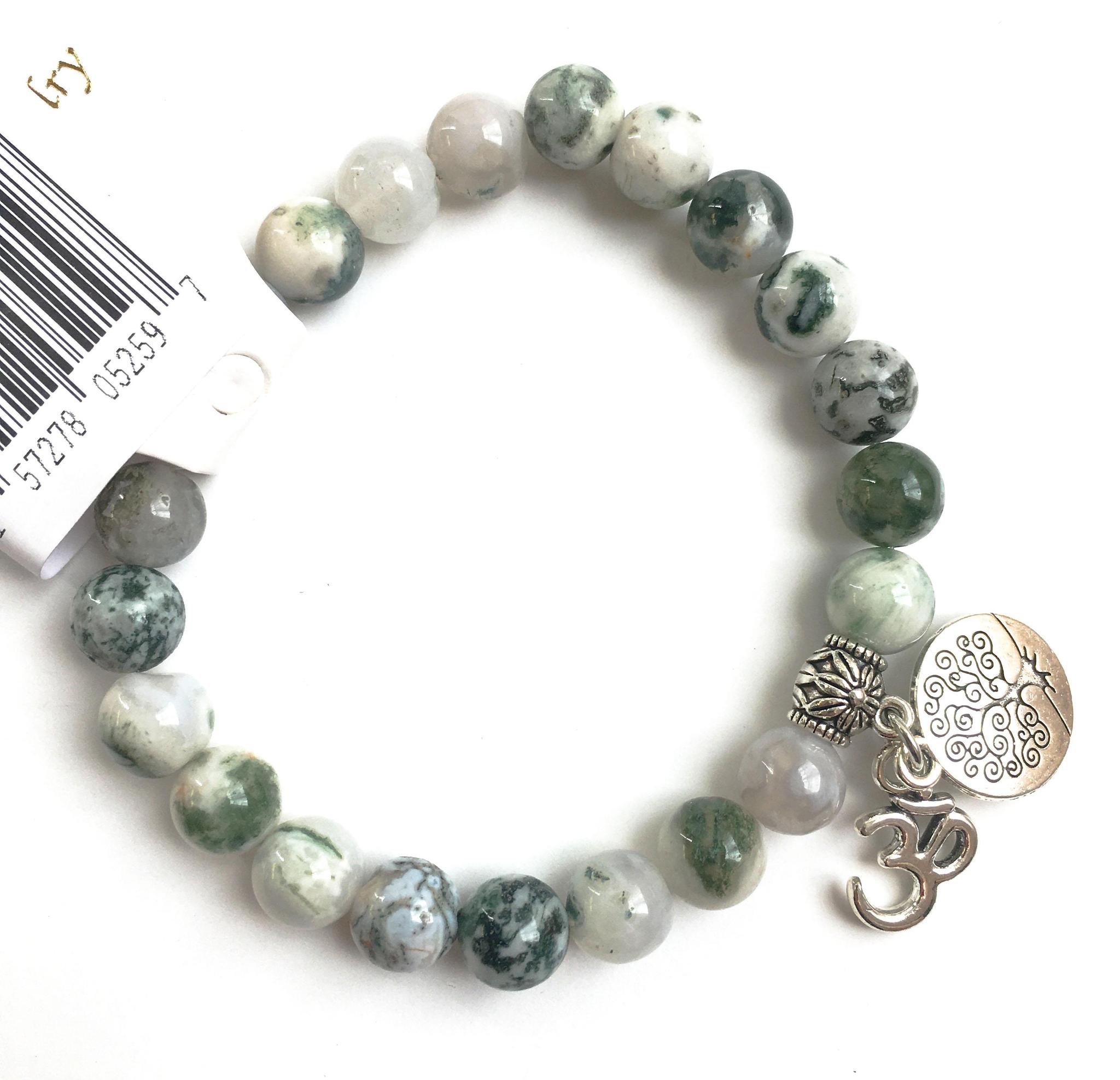 Moss Agate Natural Stone Bracelet with Buddha, Om & Tree of Life Charms 8 mm
