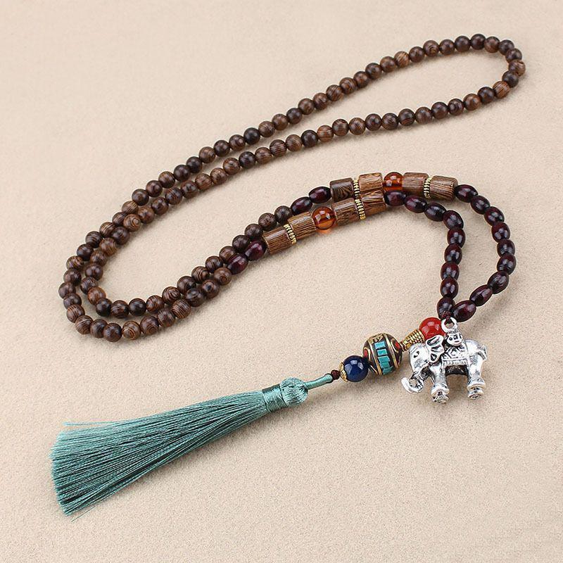 Holy Wood Beads Circular Pendant with Elephant Necklace for Energy Balancing, Positivity, Tranquility, and Meditation Vintage Nepal Long Buddhist Mala Wood Beaded Pendant & Necklace Ethnic Bohemian Boho Lucky Jewelry