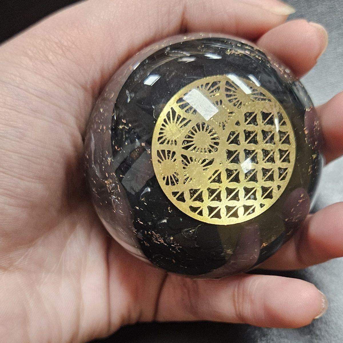 This Black Tourmaline Orgone sphere is a specialized artifact designed to be your primary line of defense. It combines raw, crushed Tourmaline with a high-density resin matrix to create a continuous shield. Within this vessel, we have placed a hand-turned copper spiral to act as an energy “pump,” ensuring your space never feels stagnant. Whether you choose the variant featuring the Tree of Life for growth and connection, or the Cho Ku Rei power symbol for focused protection, this talisman serves as a constant chronicle of safety in a frantic world.