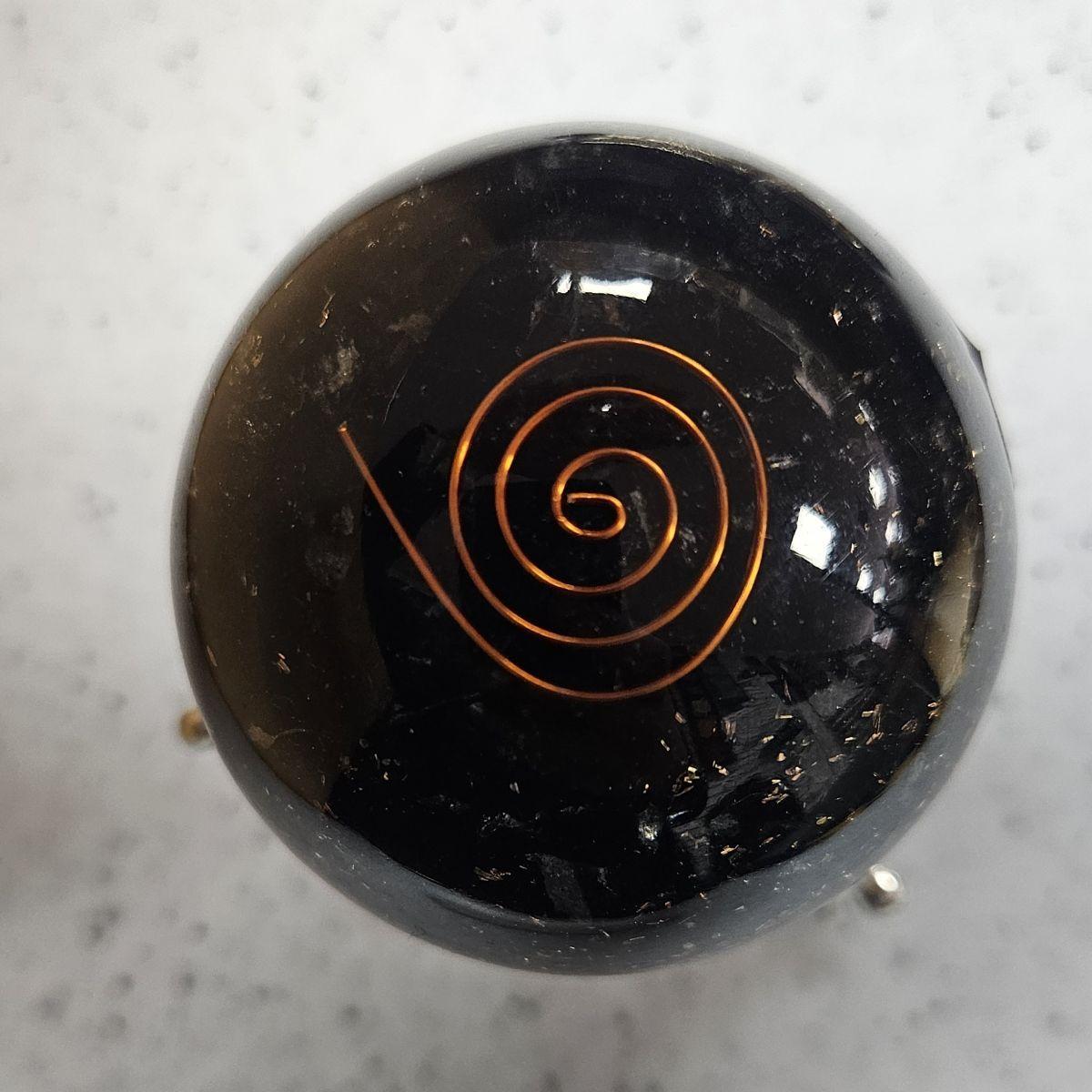 The Black Tourmaline Orgone sphere is an extraordinary artifact of deep, commanding beauty. It features a concentrated core of midnight-black and obsidian-hued Tourmaline chips suspended in clear resin, accented by a golden sacred symbol and a hand-turned copper spiral. This aesthetic serves as a visual reminder of the “Void of Protection”—acting as a shield that neutralizes stress with its weighted, authoritative presence.