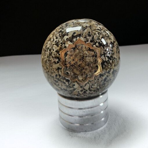 This Dalmatian Jasper Orgone sphere is a specialized vessel for those navigating times of emotional stagnation. Often called the “Stone of Joy,” this stone tells the chronicle of diverse elements—Tourmaline and Feldspar—becoming one. While the Jasper provides the grounding required for stability, the internal Orgone technology and copper spiral act as an active filter for modern “energetic noise”. This artifact radiates its protective energy in a perfect 360-degree field, making it the ultimate tool for manifestation and revitalizing the soul.