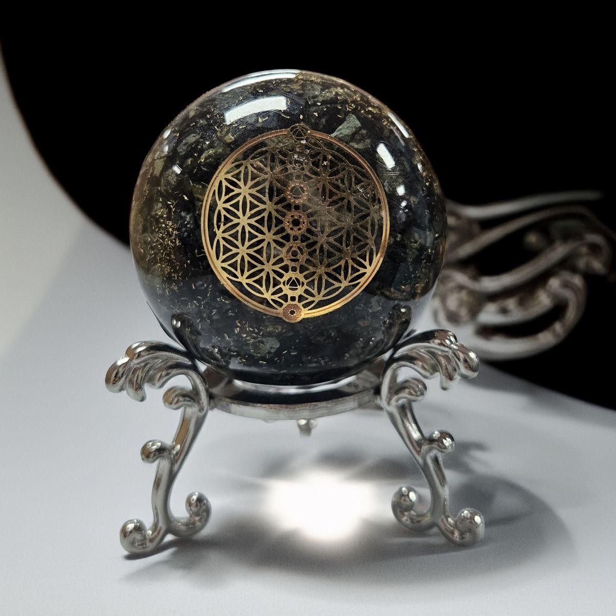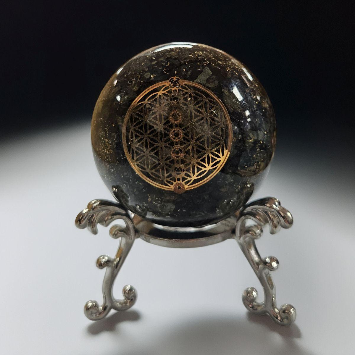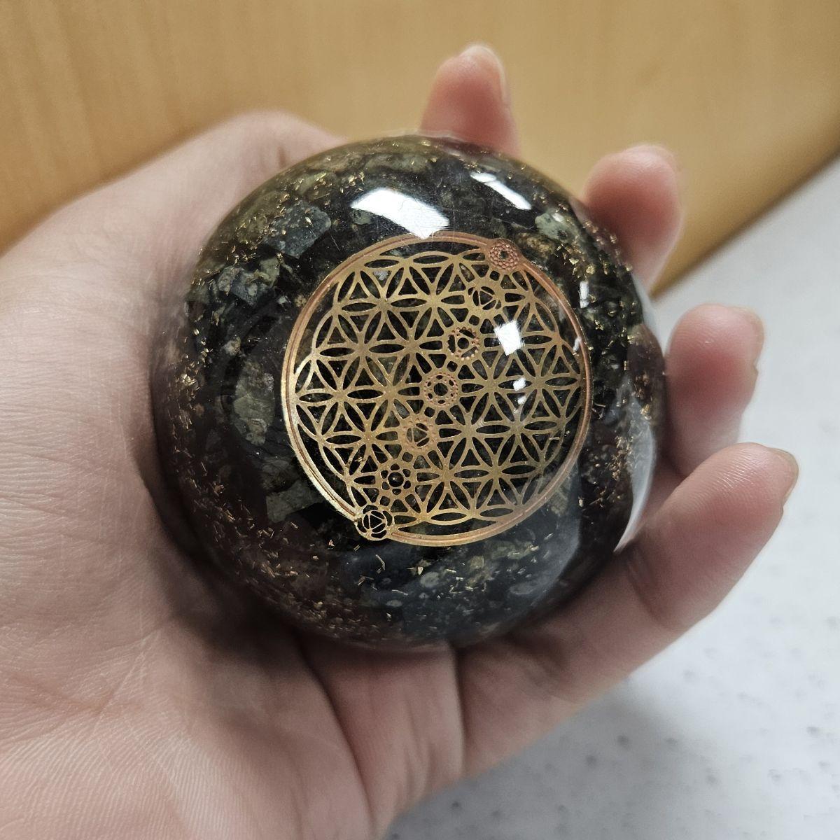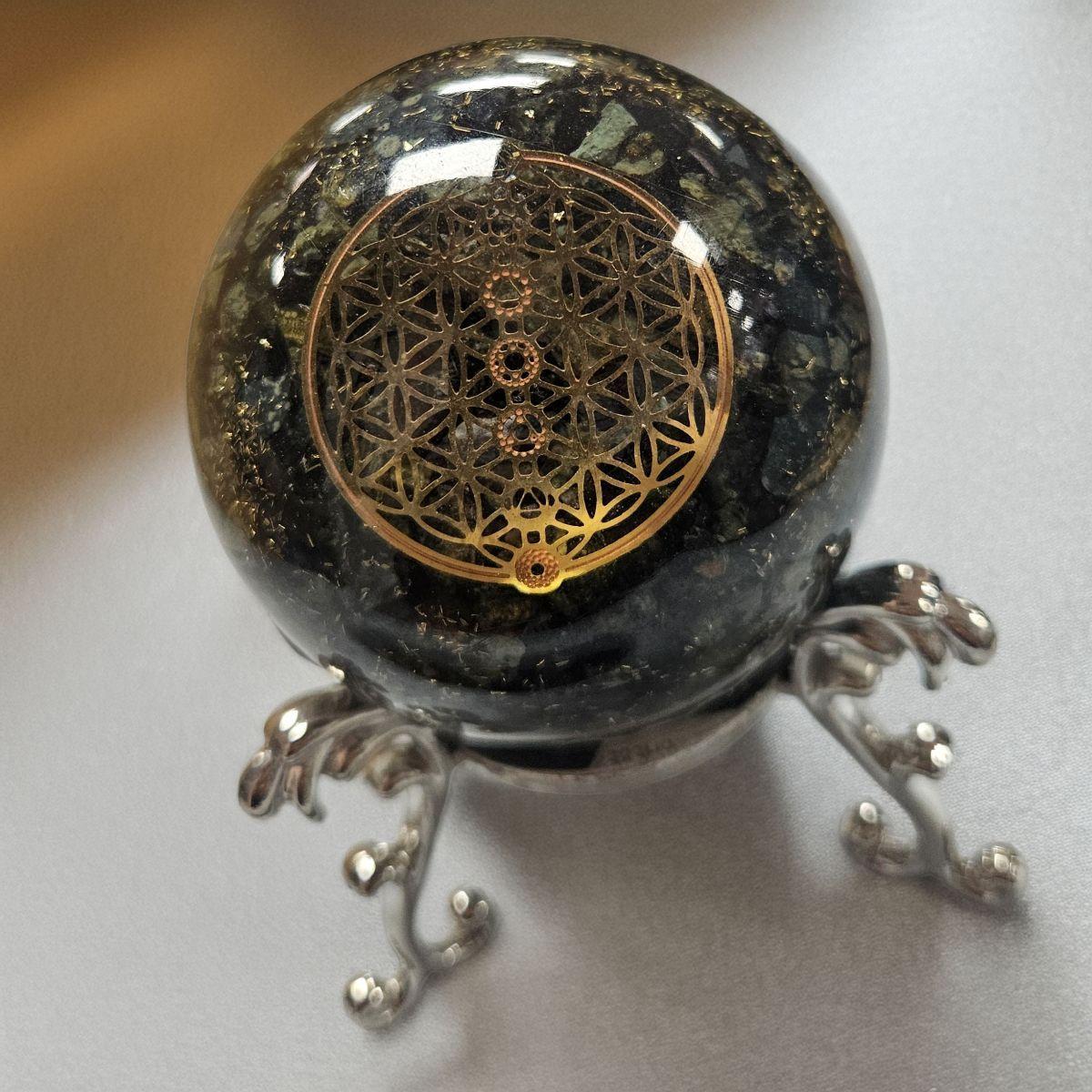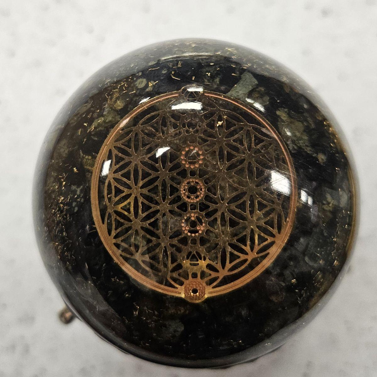 The Kambaba Jasper Orgone sphere is an extraordinary artifact of mysterious, prehistoric beauty. It features a concentrated core of deep forest-green and midnight-swirl Jasper chips suspended in clear resin. These earthen colors are accented by a golden sacred symbol (such as the Flower of Life or Sri Yantra) on one side and a hand-turned copper SBB spiral on the other. This aesthetic serves as a visual reminder of the “Oldest Living Stone”—acting as a shield that neutralizes stress with its weighted, authoritative presence.