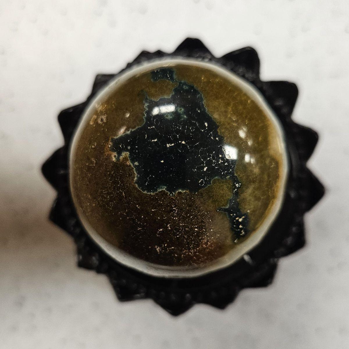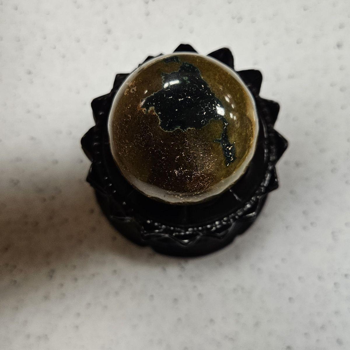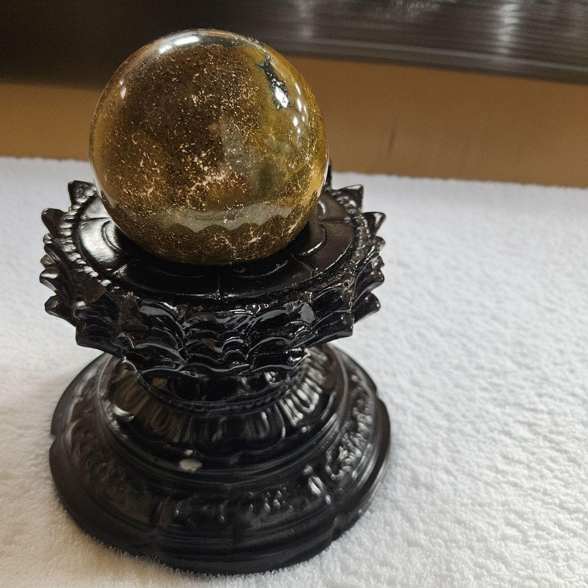- Clear Glass Base: Using a clear glass or acrylic base allows light to pass through the stone from underneath, highlighting the intricate orbicular patterns without distracting from the sphere’s energy.