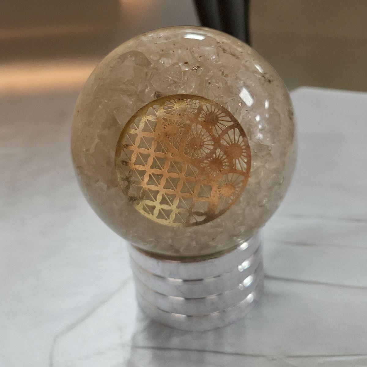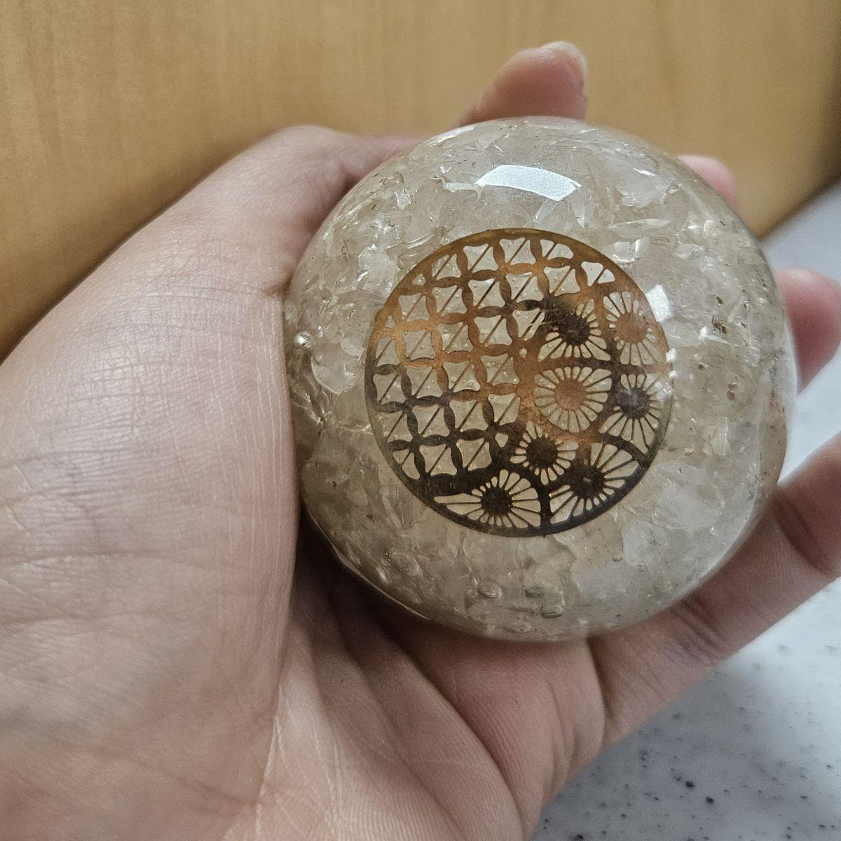 The Clear Quartz Orgone sphere is an extraordinary artifact of luminous, crystalline beauty. It features a concentrated core of translucent and ice-clear Quartz chips suspended in high-grade resin. These earthen fragments are accented by an intricate golden sacred symbol and a hand-turned copper SBB spiral at the back of each variant. This aesthetic serves as a visual reminder of “Clarity through Focus”—acting as a shield that neutralizes stress with its weighted, authoritative presence.