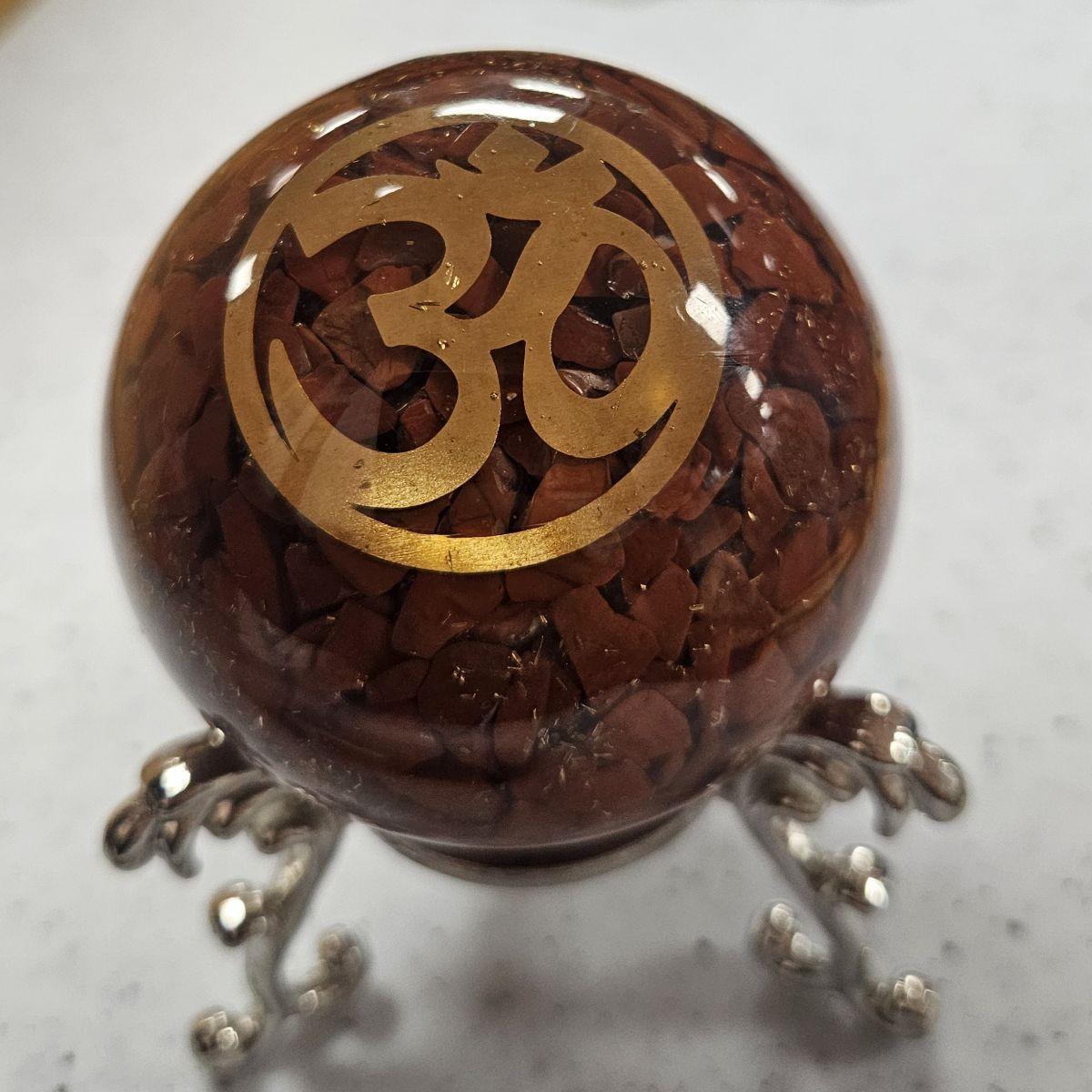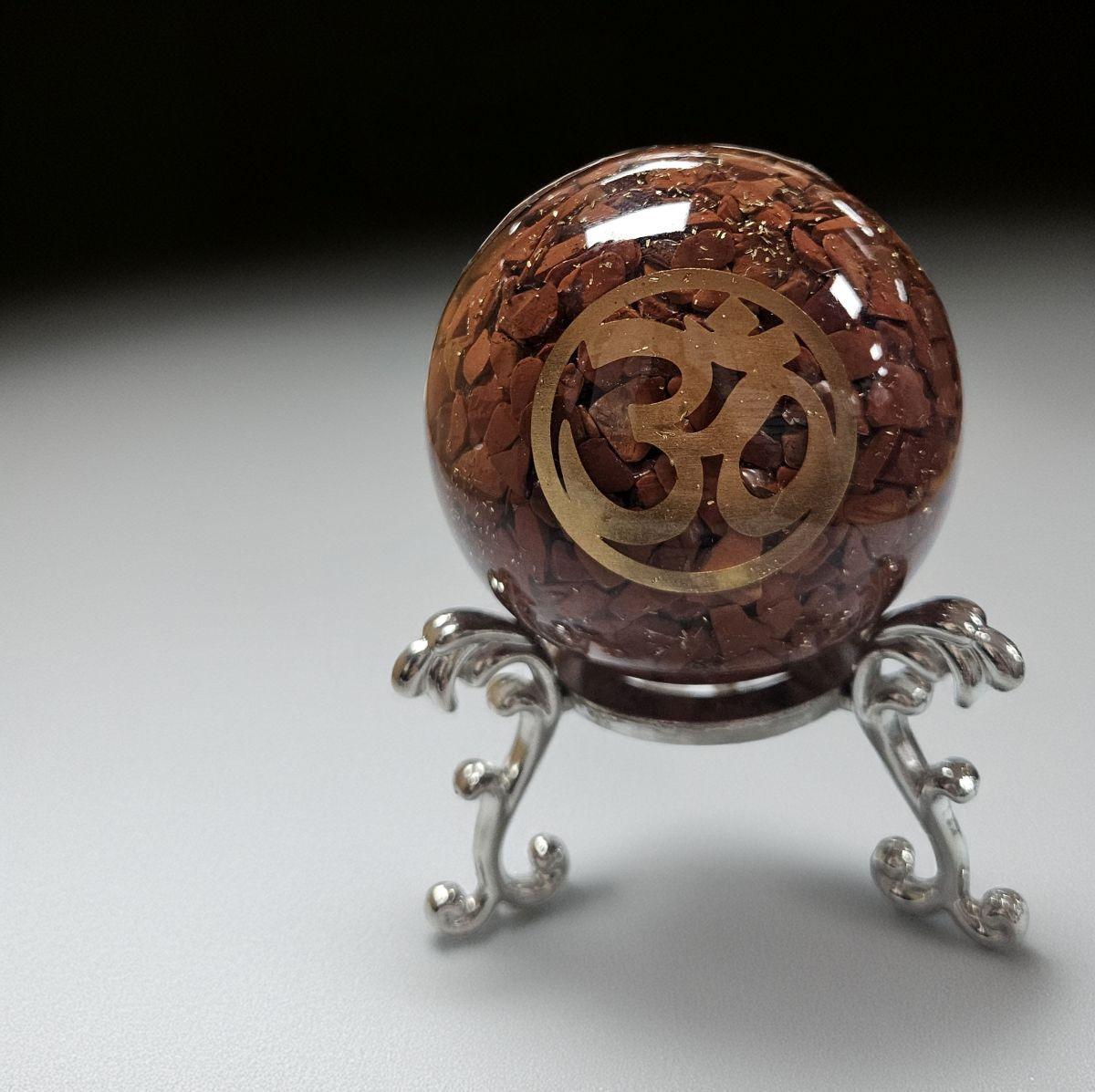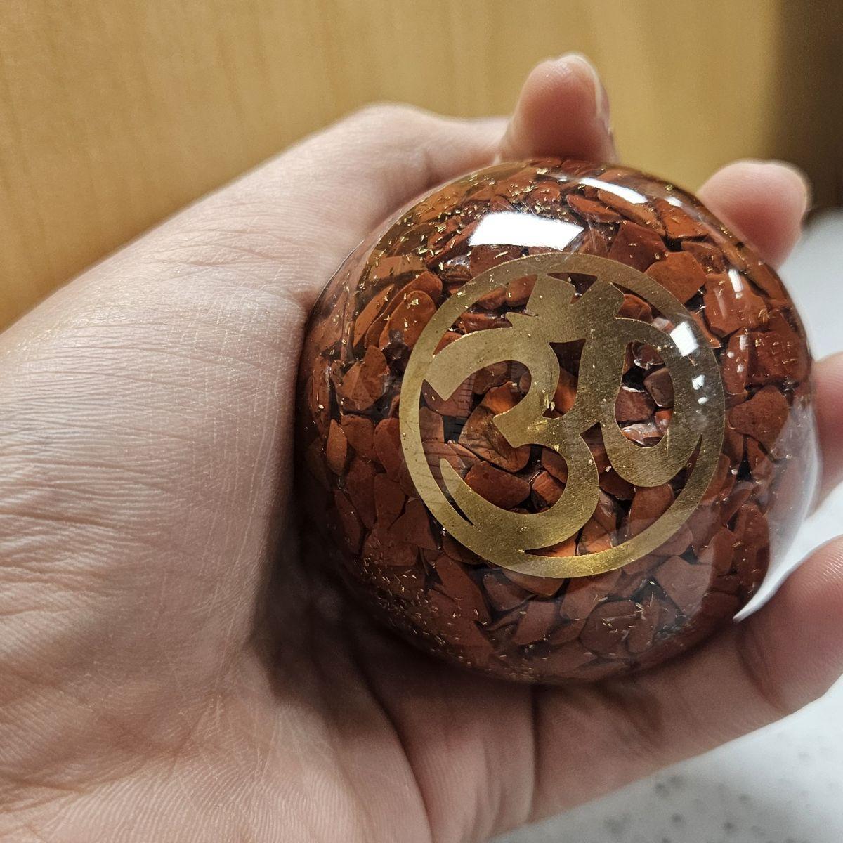 The Red Jasper Orgone sphere is an extraordinary artifact of bold, smoldering beauty. It features a concentrated core of terracotta-red and deep brick Jasper chips suspended in clear resin. These earthen colors are accented by a golden Om symbol and a hand-turned copper SBB spiral. This aesthetic serves as a visual reminder of the “Blood of the Earth”—acting as a shield that neutralizes stress with its weighted, authoritative presence.