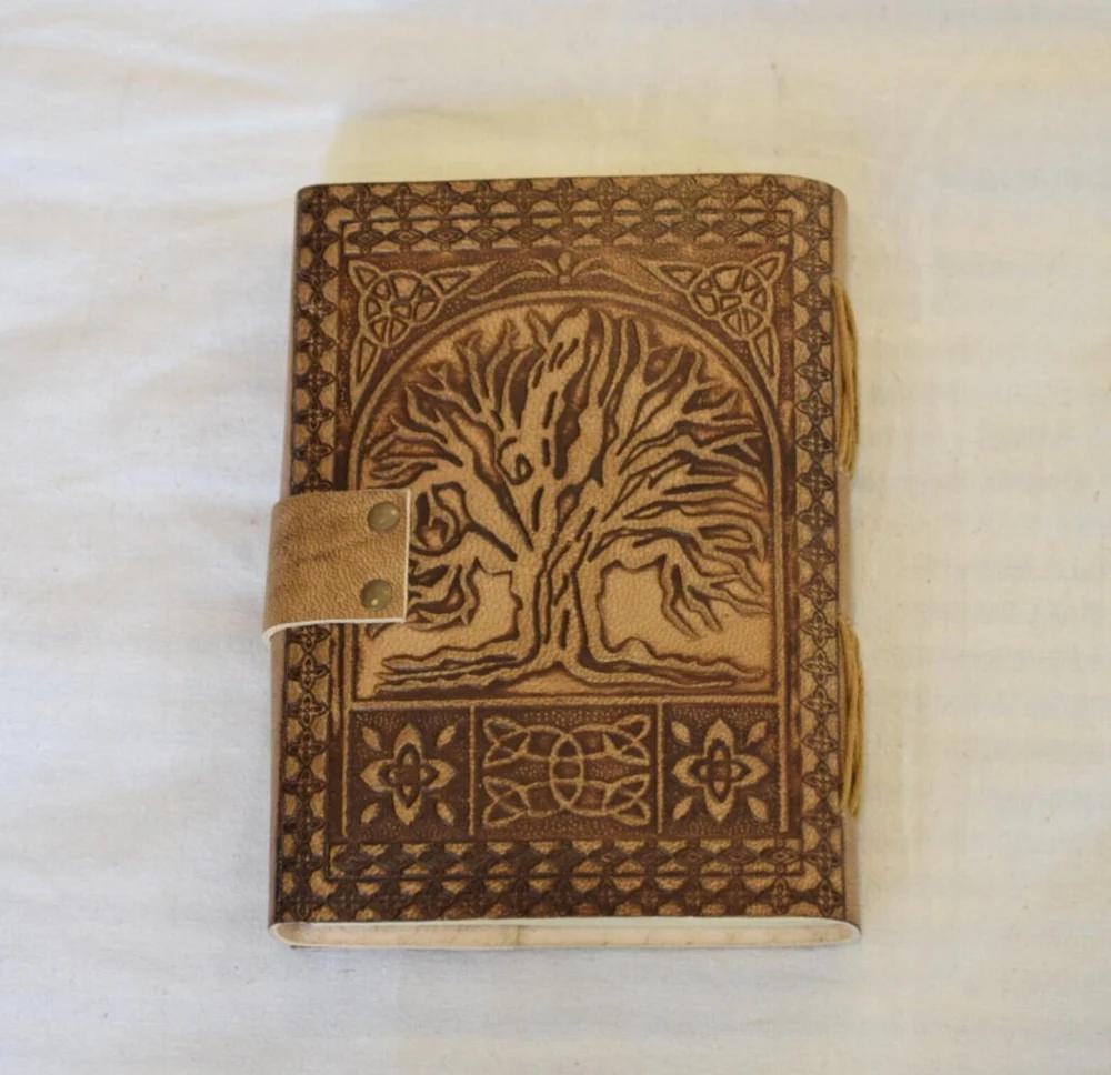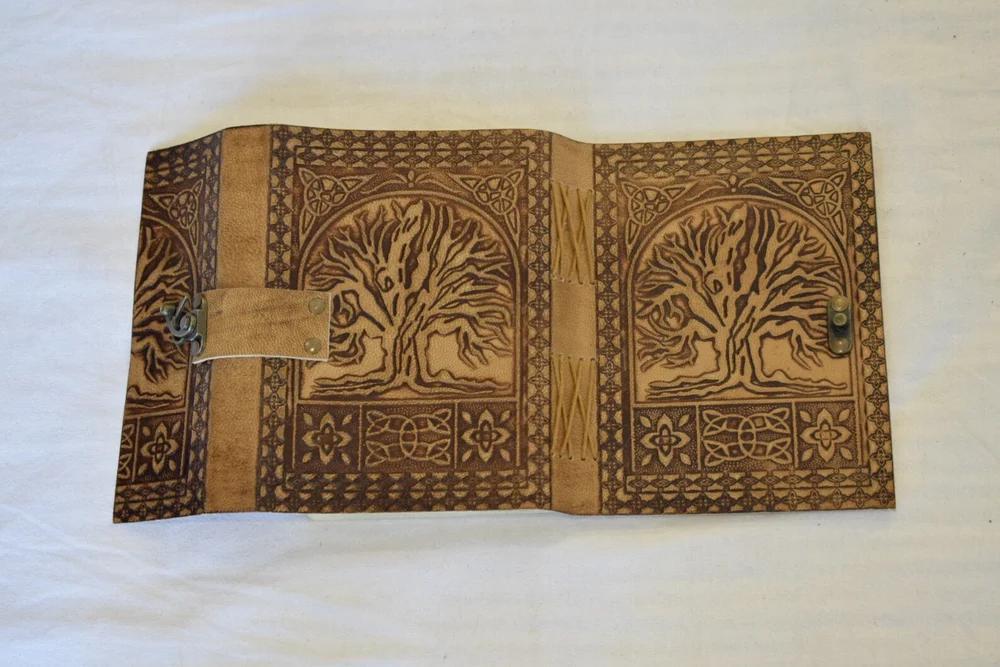 - Material: Genuine natural tan leather, deeply embossed with a Celtic Tree of Life (Yggdrasil) and knotwork design.