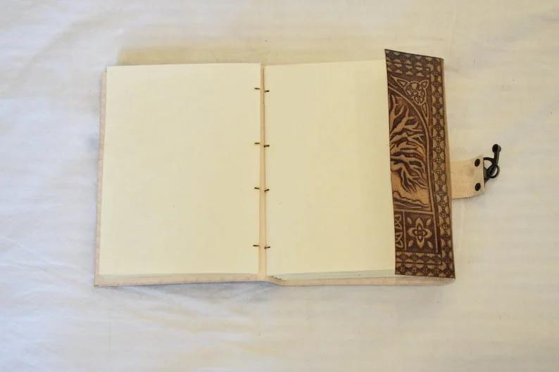 This journal features a traditional embossing technique. The Tree of Life and Celtic designs are deeply pressed into the leather, creating a rich, tactile, three-dimensional effect that adds to its classic, handcrafted feel.
