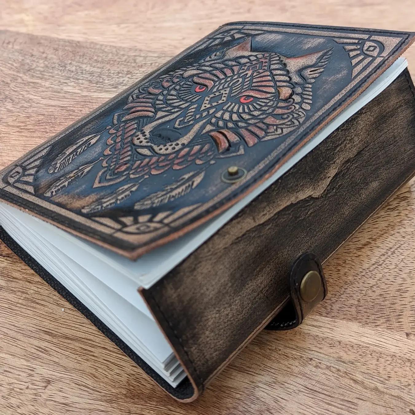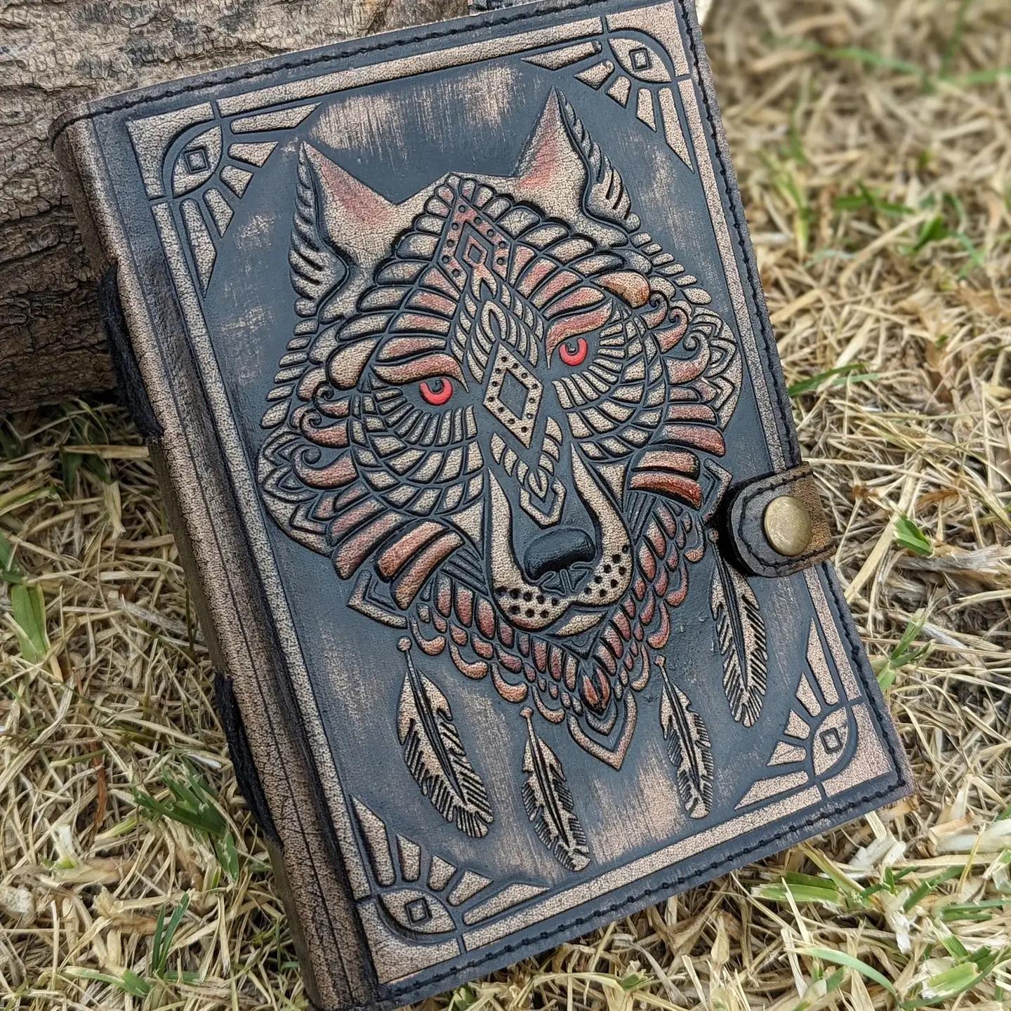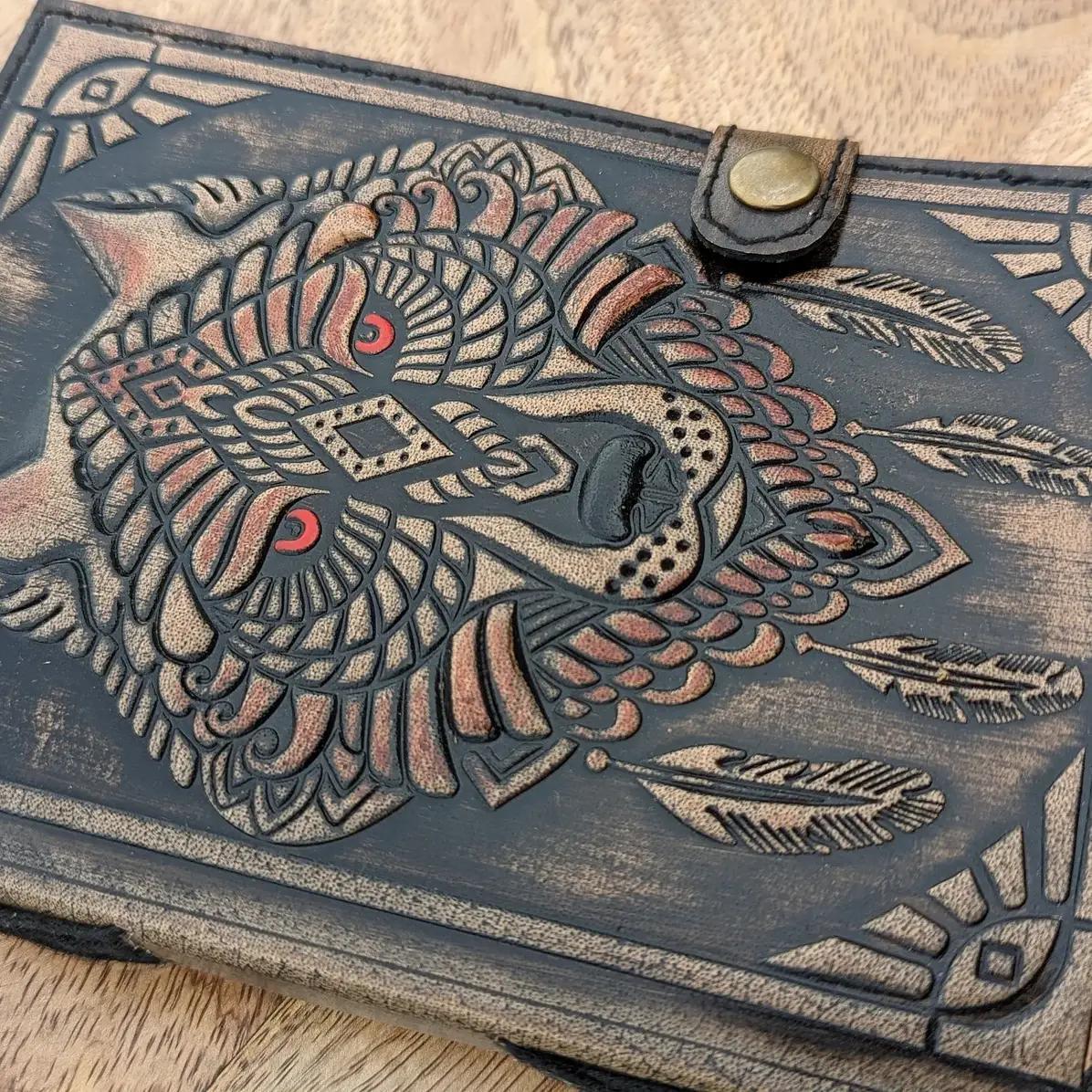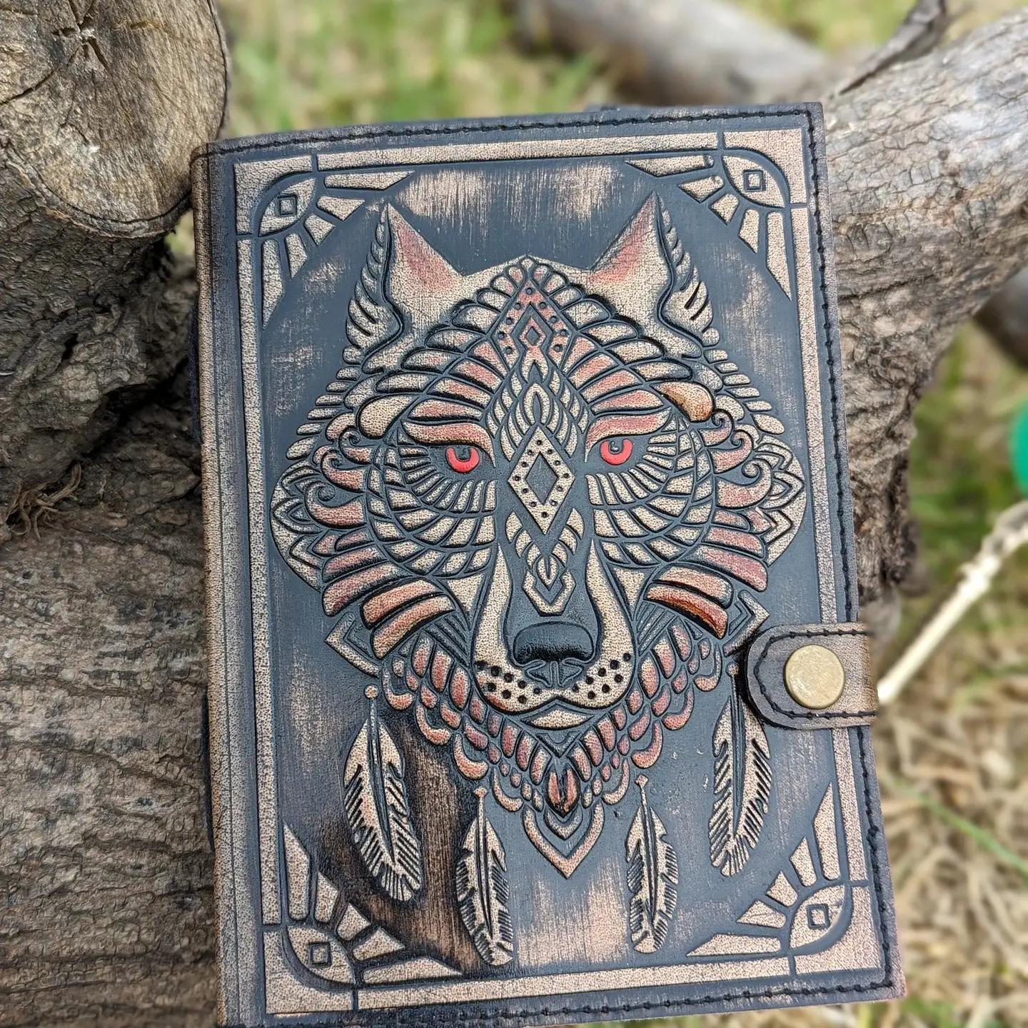 - Material: Genuine dark distressed leather, deeply embossed and hand-detailed with a tribal Spirit Wolf motif.