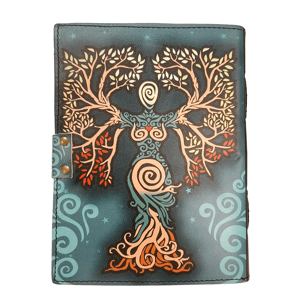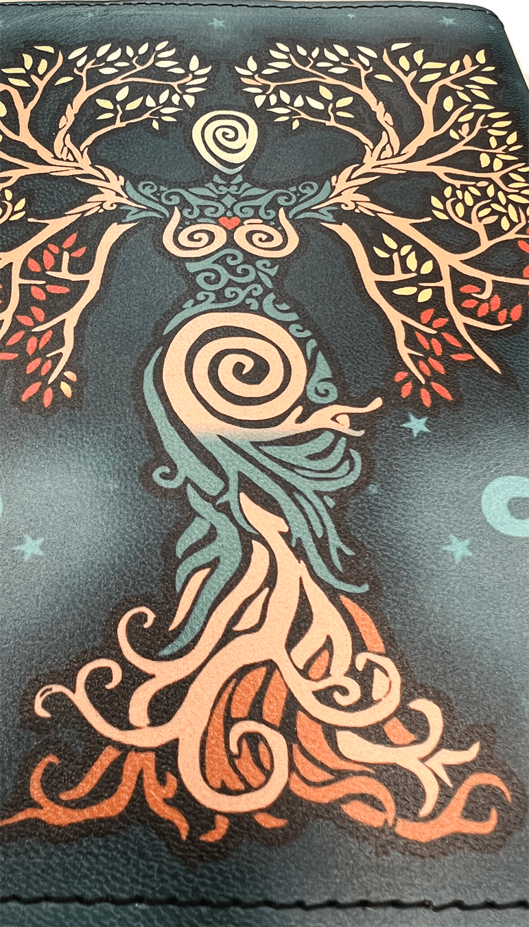 - Design: Features a stunning full-color print of the “Tree of Life Goddess” on a celestial teal background with stars and swirls.