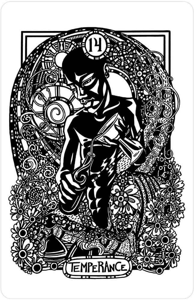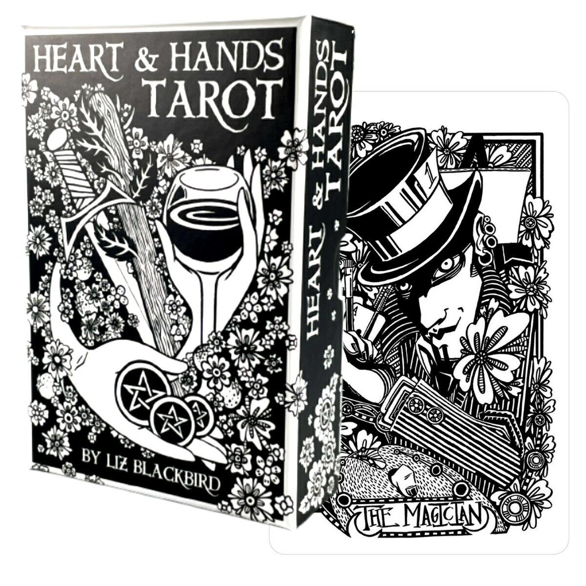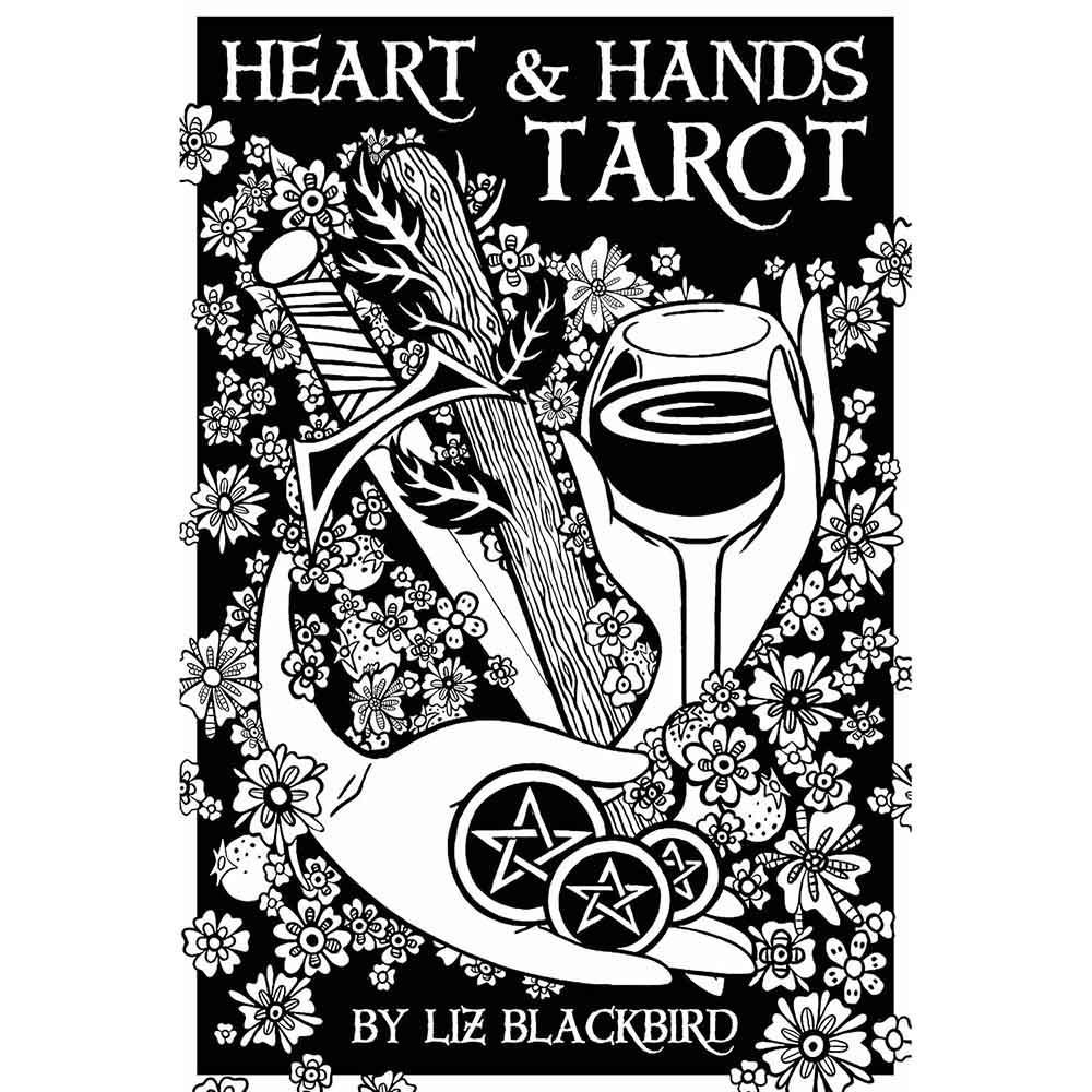 The Heart & Hands Tarot deck was made by artist and illustrator Liz Blackbird over the course of different stages of her life, and it symbolizes a personal journey and a true labor of love. The conventional symbols and figures of the original Rider-Waite-Smith Tarot deck serve as the foundation for the deck’s diverse iconography, which is artistically brought together by a sophisticated line-drawing method. Figures and flowers overflow the frames of the pictures; the graphics’ ebullience conveys the strength of the cards and the artist’s delight in producing them.