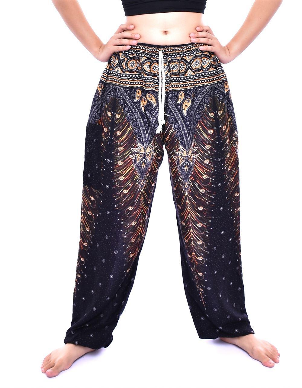 Black Yellow Peacock feather Print draw string Thai Harem Pants with single pocket 100% Rayon