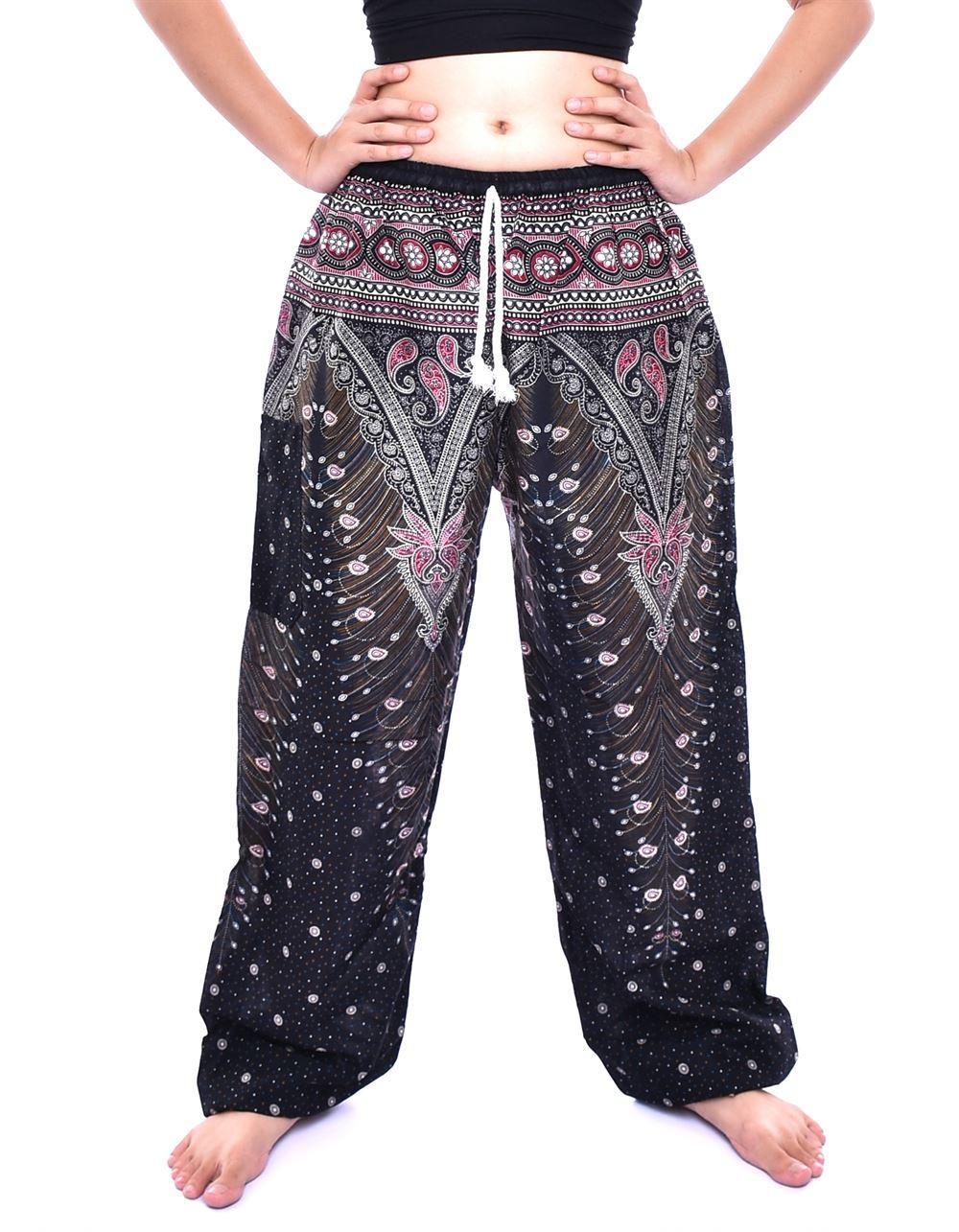 Black Green Gold Peacock feather Print draw string Thai Harem Pants with single pocket 100% Rayon